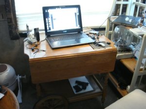 When I got home, I unscrewed my table from the floor for the third time. I can’t seem to make up my mind on what kind of table I want there, but I think this is it. Just right for my laptop and my gazillion gadgets hooked up via USB.