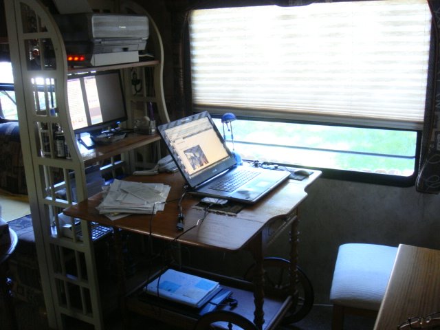 I had to do some rearranging this morning to get rid of this pain I was getting in the back of my neck. This was due to my chair at my desk being about an inch lower in the rear than in the front. My chair was straddling the bump out and the main floor. It looks like this is going to be much better. I will see once I work on the computer for a couple of hours. 🙂 Now the extra monitor sits on the shelf right in back of my laptop instead of to the side.
