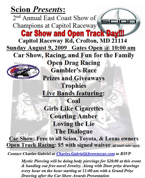 This coming Sunday is the Scion Show of Champions at the Capitol Raceway, Crofton, Maryland. Last year I got my second tattoo on that day. LOL, I wonder what I’ll come home with this year….no, no more tattoos.