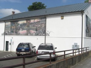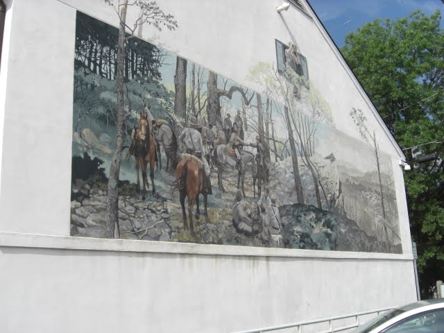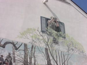 Whoever painted those murals is very talented. The man looking out of the window with binoculars definitely looks like a Banksy job.