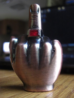 This is the lighter that my sister brought back from vacationing in Florida. When you push the finger, it says; “Fuck You!”