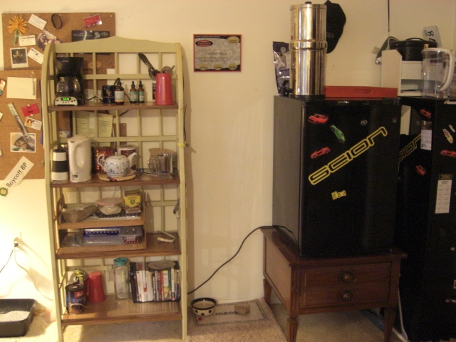 On the left there is my vertical coffee/tea nook. On the right is the fridge sitting on the nightstand with the small Berkey water filter on top.