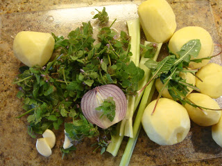 Purple Dead Nettle, Dandelion, red onion, yukon potatoes, celery and garlic.