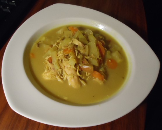 - I was going to cook curried chicken over spinach…but didn’t have any spinach. It called for raw chicken, but I cooked the whole chicken, took the meat off the bones and cooked the hell out of the bones to make some awesome chicken broth. Didn’t have any ginger either. So it was time to improvise. I added the apples because like like my curry to have a hint of sweetness. It turned out pretty good. 🙂