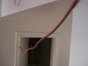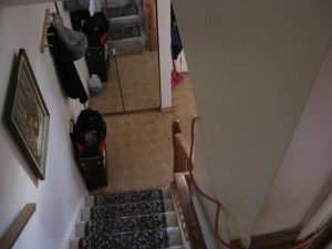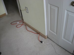 At this time, the only thing running downstairs is the refrigerator and the clock in the stove, which I don’t know how to disconnect. Everything else is on surge protectors and gets shut off after use. Now the heater is plugged into the downstairs bathroom. The only problem with this setup is that now you can’t close the bathroom door.