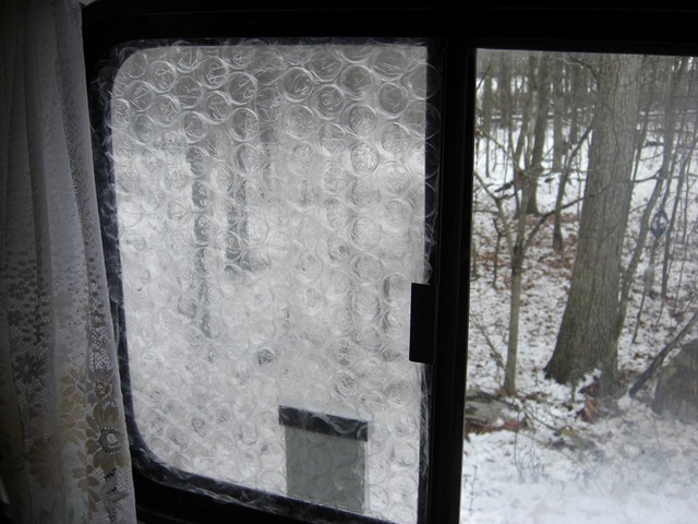 One of the most worried about things when living in a travel trailer full time is the condensation. The bubble wrap has stopped most of it. The only place that I have to wipe off daily is the metal frame that surrounds each window. Last year I was using 3 or 4 towels a day to get rid of the puddle in the frames. No condensation on the walls or anywhere else. That’s good news….no mold growing here. 🙂