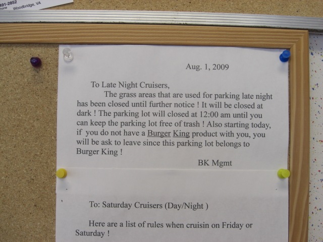 It always really pissed me off when people disrespected the Burger King property by leaving their trash all over the lot, even though there are trash cans everywhere.  Every couple of months the Burger King management gets fed up with having to deal with picking up all the trash afterward in the middle of the night and shut the place down early.  Usually, they will call the Prince William County Police to help clear out their lot.