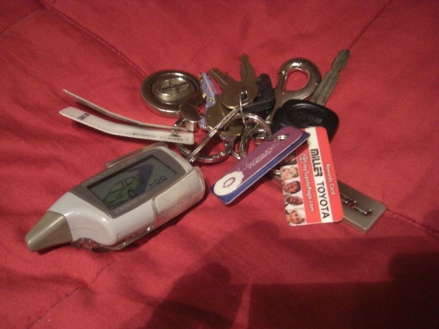 Yesterday my dear son, T-Jay stopped by to borrow the Evil Twin, so I gave him the keys that I keep attached to the loop of my belt on my pants. There is a set in the car that I put in the ignition and then there is the set that stays on me at all times which has the remote for the alarm on it.