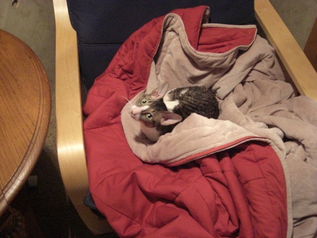 There is my pussy on “HER” chair. That blanket WAS neatly folded up when I left for work yesterday. Wonder how long it took her to mess it up like that?