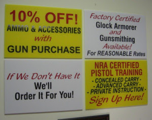 I couldn’t get a good picture of the beautiful handguns in the case due to the top glass being pretty scratched up. I’ll have to catch Jimmy or Greg when they pull all his pretty babies out of the gun safe one day. They are beauties.