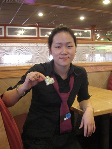 I have stopped there many times over the past few weeks to get my Sushi fix. I know, I know….your sick and tired of reading about Sushi. 🙂 LOL…..I have been there so often that I know the waitresses by name. This is my favorite waitress Annie. She made me this present the last time I was there.