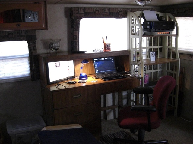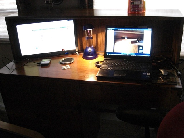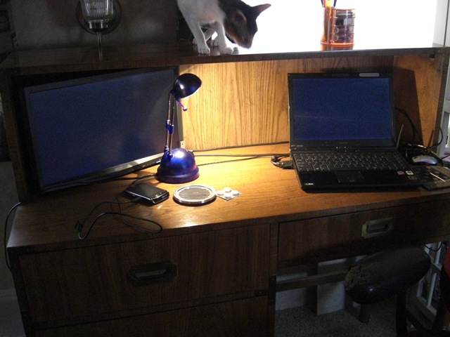 At first, I had the 2nd monitor on top of that small hutch, but looking up there made my neck hurt. So I removed the stand from the monitor and put it inside the hutch. Then I had to lower my chair because the lip on the hutch was hiding the top of the screen. I didn’t like that either so I removed the lip and then removed the light that was attached to the inside of the hutch.