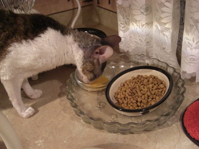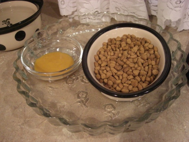 I still got some. Every day I see two or three of them, even though I have ant baits set out. I’m thinking that they are eating cat food instead. So I found this gadget for 30 some bucks. It’s a tray that has water underneath to keep the ants from getting to other food. It was time to improvise….