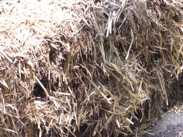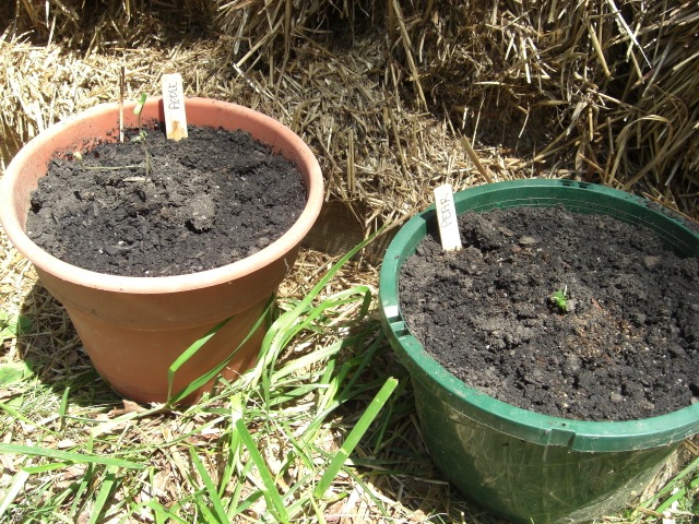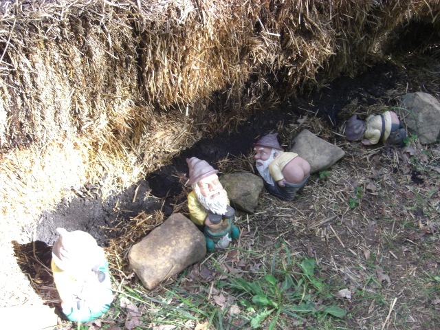 Early this morning I planted Spinach along the bottom of the straw. LOL….the gnomes are guarding it!
