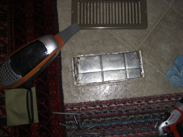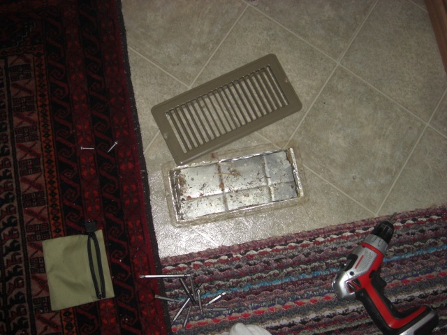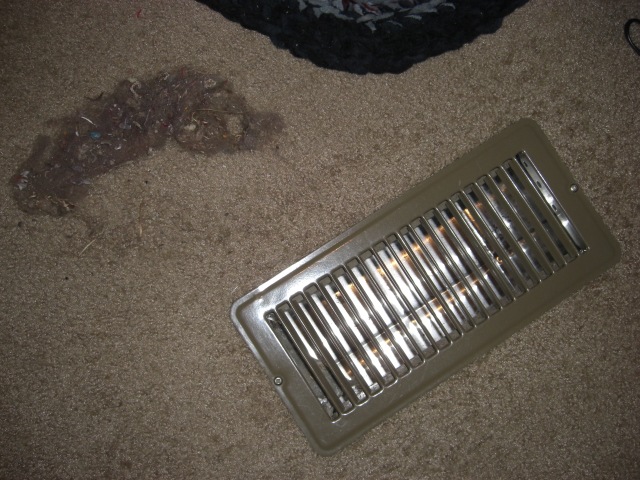 Since it’s getting a bit chilly around here, I decided to move the rugs and uncover the registers (is that what they are called?) for the furnace. It looked pretty disgusting, so I removed the covers to get the stuff out that had fallen in.