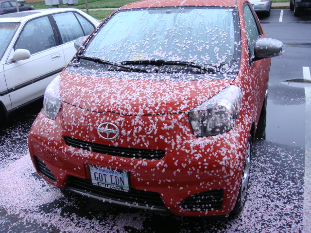 The iQuteness was covered with them so bad that I had to hose her off before I left for a car chase this morning. I need to get it off of the sidewalk because no matter how hard T-Jay and I try, we keep tracking it in the house. This morning it looked like someone had puked in the hallway until you look closely and realize that they are lumps of flower petals from the cherry tree.