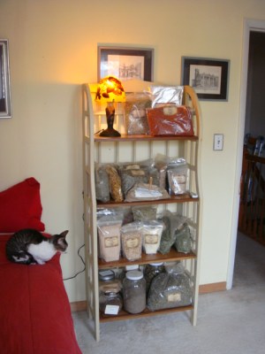I’m still organizing and moving stuff. I went under the stairs this morning and got out all my herbs and powders. Got the shelf unit out of the shed and up in my bedroom so that I could use it for my goodies. Sure is nice to have everything in one place and easy to find when I need it.