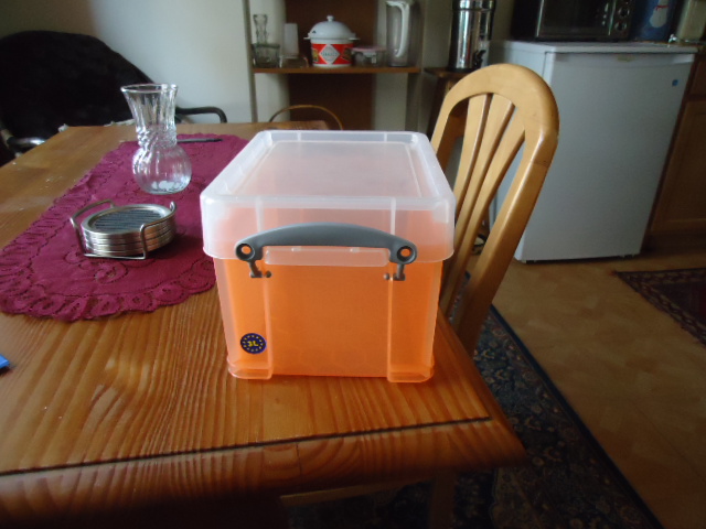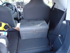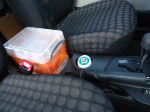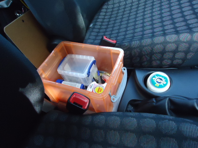 I have had to use some creative ideas to add storage areas to my car. My dear friend Teya came up with this inexpensive, useful little modification. The Really Useful Box has boxes that fit perfectly between the front seats and come in different colors and sizes to choose from. I was lucky and found orange, to go with my car.