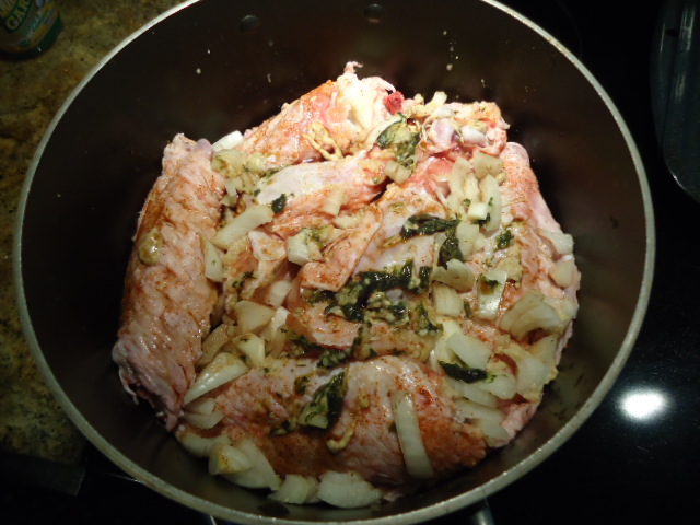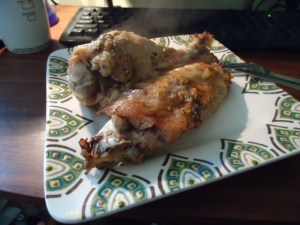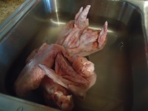 I cut the wing tips off since there isn’t much meat on them. Rubbed on some Creole Seasoning, basil, garlic and a bit of dill. Ha, that’s a lot of meat!!! 🙂