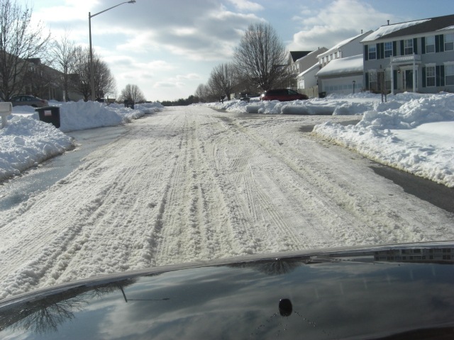 Yesterday was a major nail biting butt hole puckering day. All the main roads were dry and easy to travel on, but the individual subdivision were in a mess. Some of them only had enough space cleared for one car to drive through…others didn’t remove ANY snow at all…