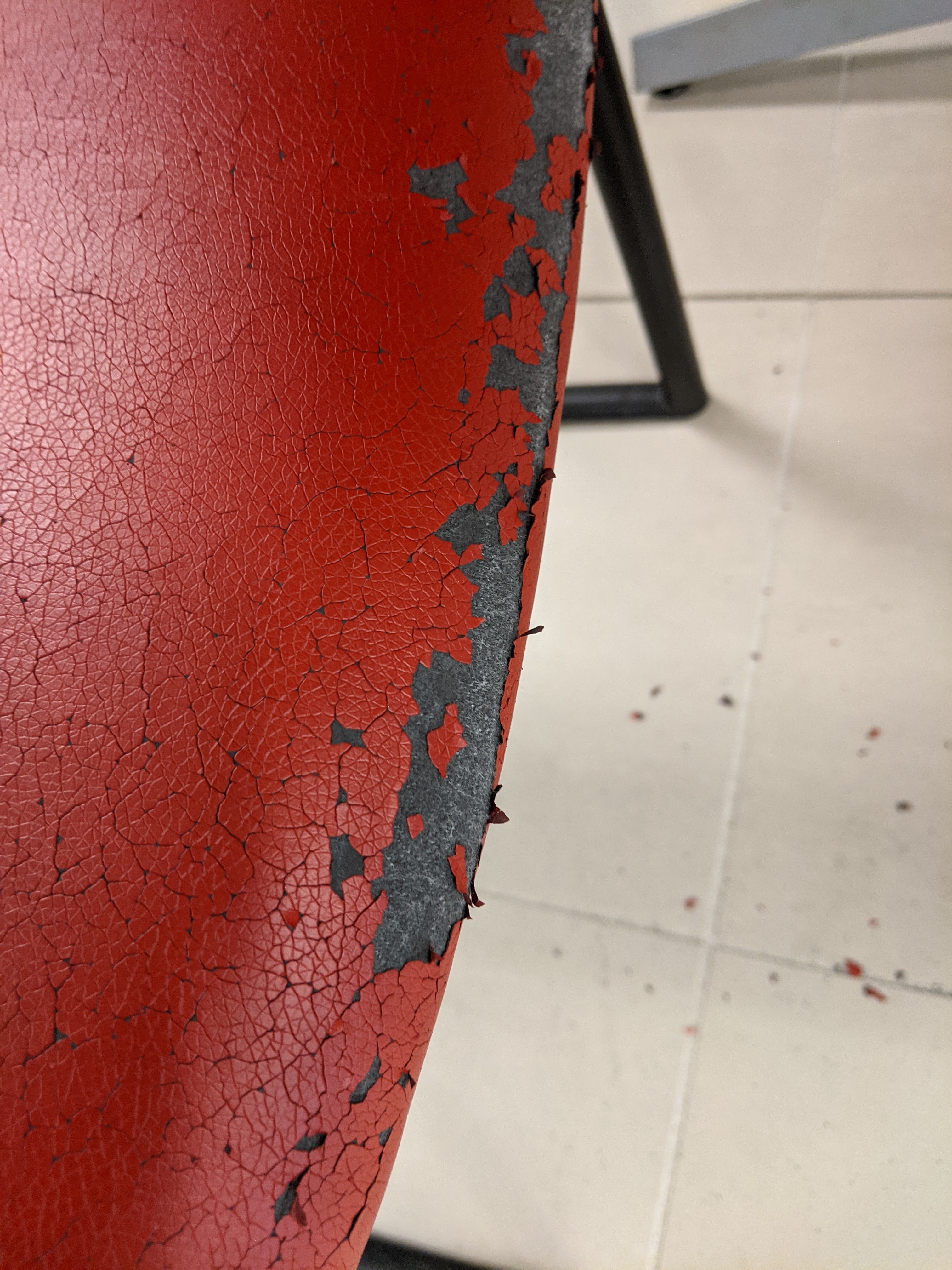 I’m at work now, looking at our poor chairs. These are not worn, they have been picked at by our nice customers who care so much about other peoples property.