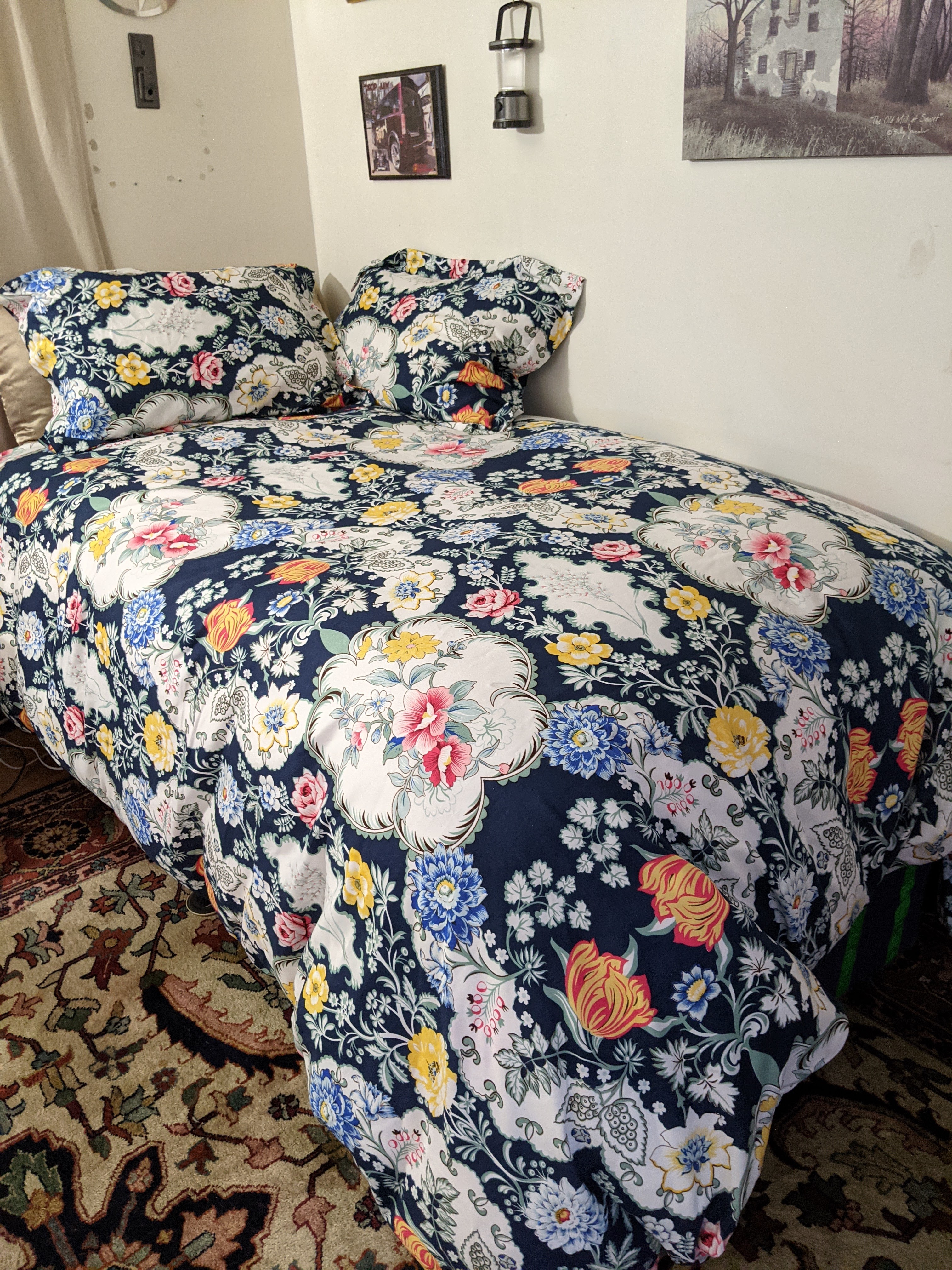 I’ve realized that sleeping on a twin bed is very comfortable for me. At first I thought it would be a problem and wondered if I would fall off of the bed in my sleep. That would have been painful since the bed frame is 18 inches tall and the mattress another 14 inches. I guess our bodies know what space is available while we sleep?