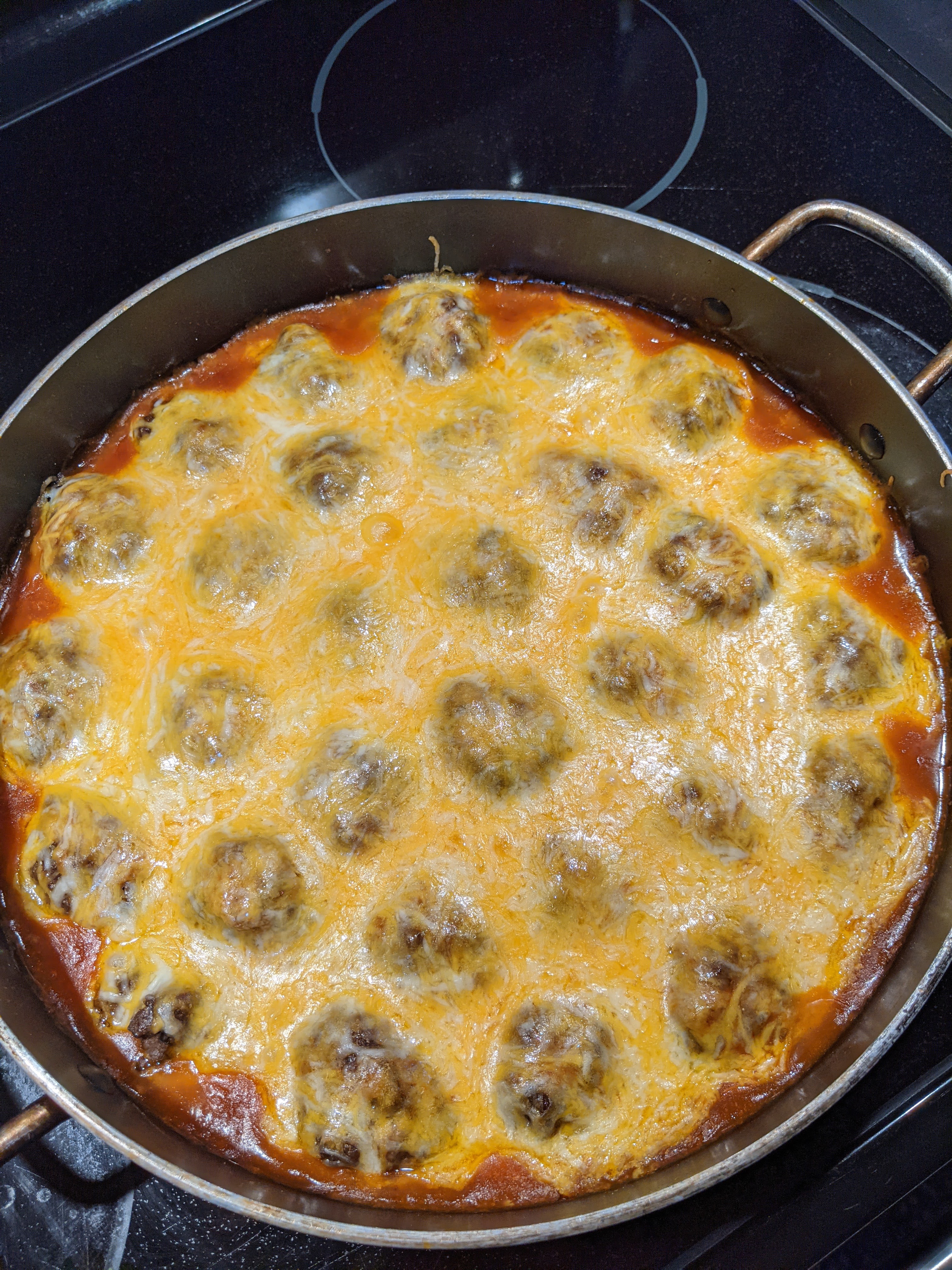 * 3) Place cooked meatballs into the dish and top with remaining enchilada sauce. Top with shredded cheese.