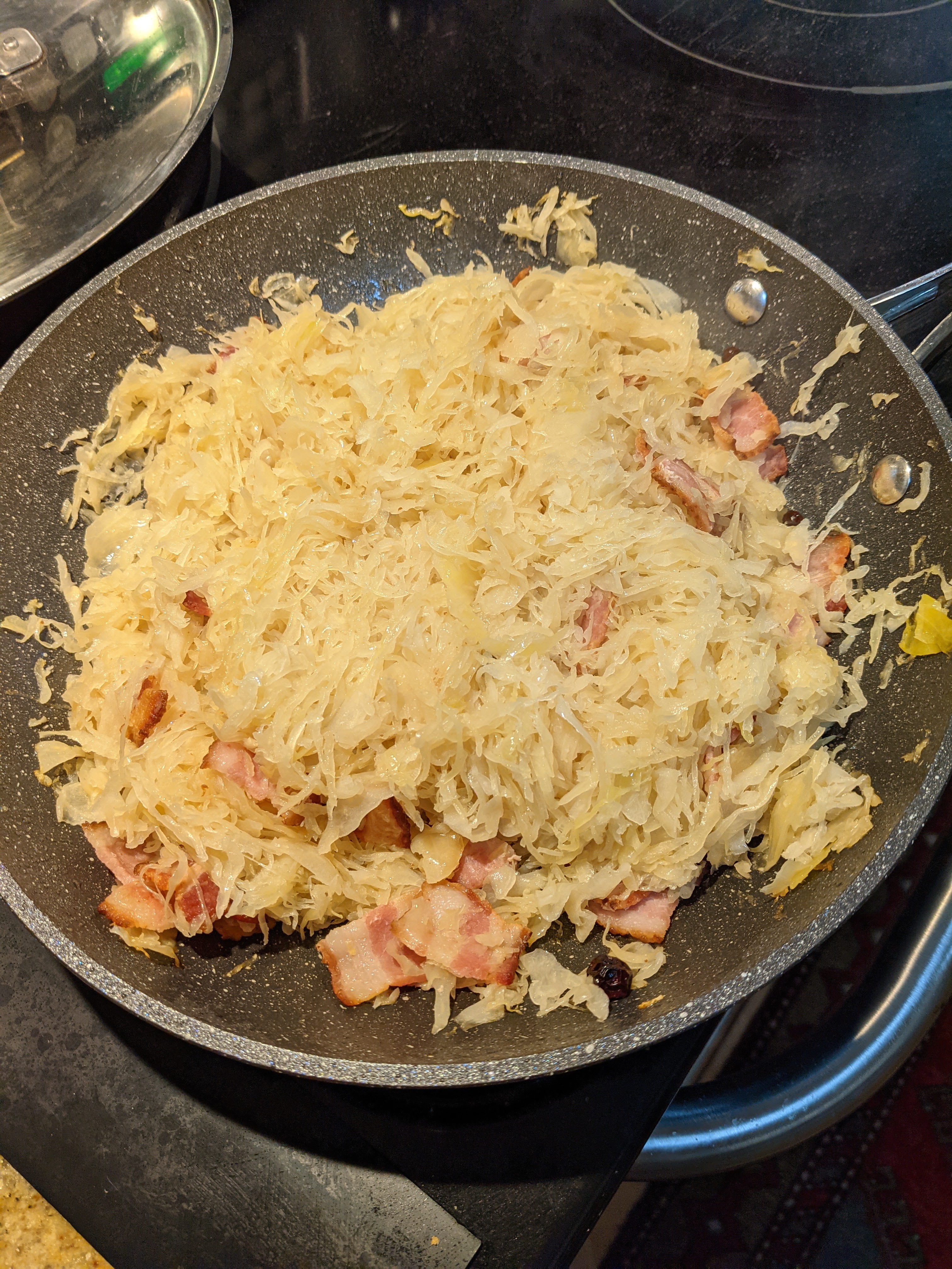 On my way to Lowe’s this morning I found out that we now have a Big Lots. I stopped by and found a couple of jars of Bavarian Sauerkraut. I fried it up with some bacon.