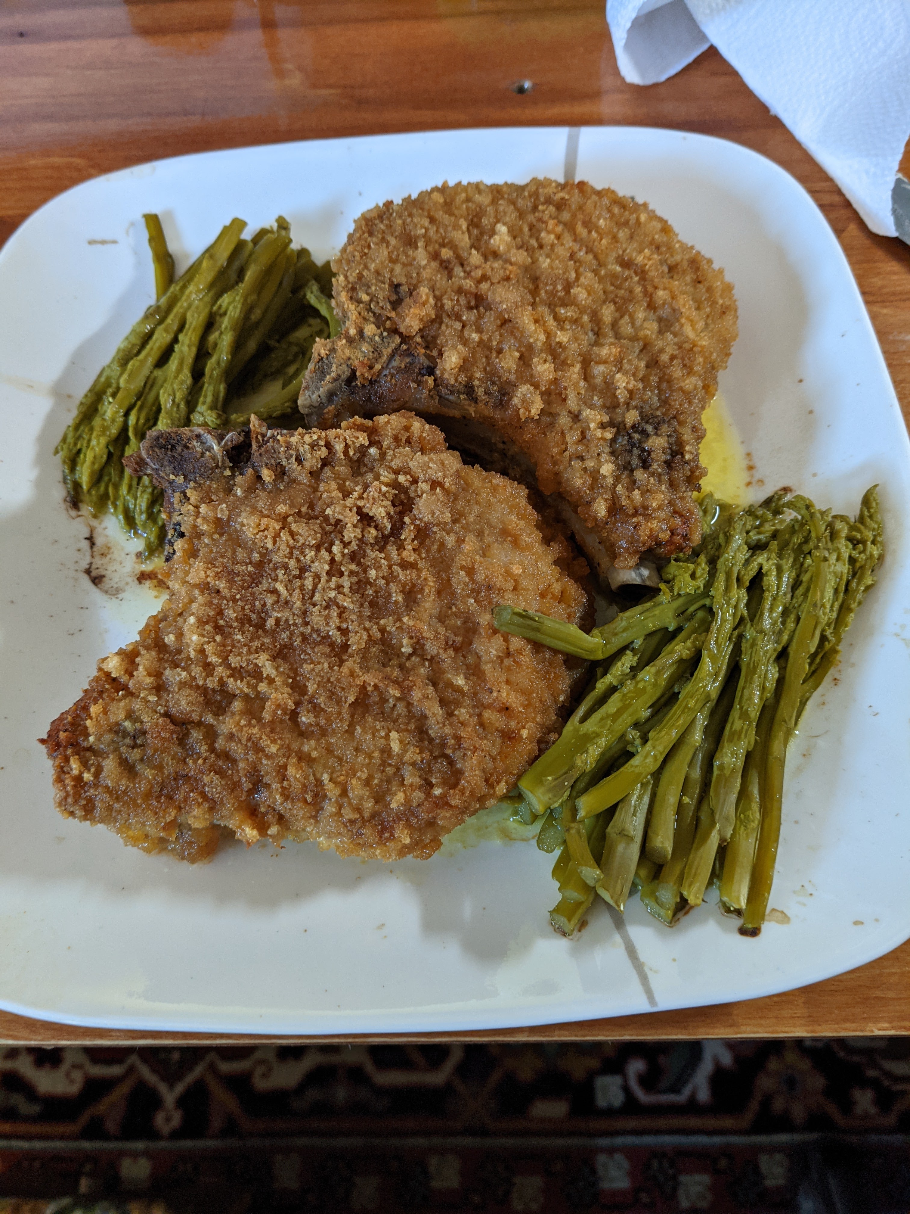 Breakfast, lunch and dinner today is thick pork chops breaded with pork rinds baked in the oven with asparagus in butter. Good stuff. Not enough for the week, but I have some leftovers for a few days. I still have meals in the freezer from the last couple of weeks.