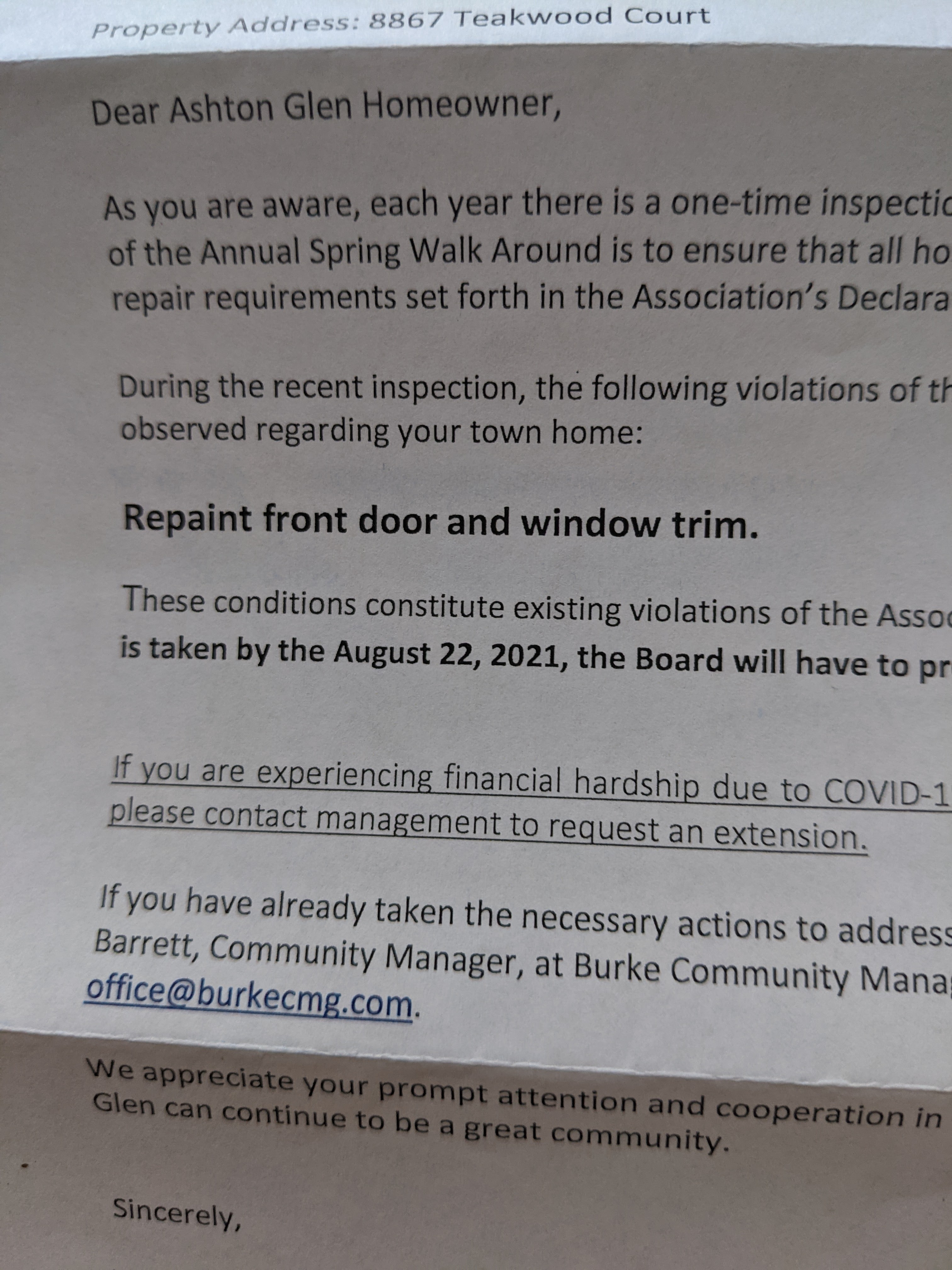 I knew it. No way would they pass me by without writing me up for something. The door I already took care of this morning with some SuperClean spray. It was just dirty from the elements outside. It’s all white again. The trim around the door and windows just need to be power washed. That will be taken care of when my neighbor does his….hopefully before the deadline.