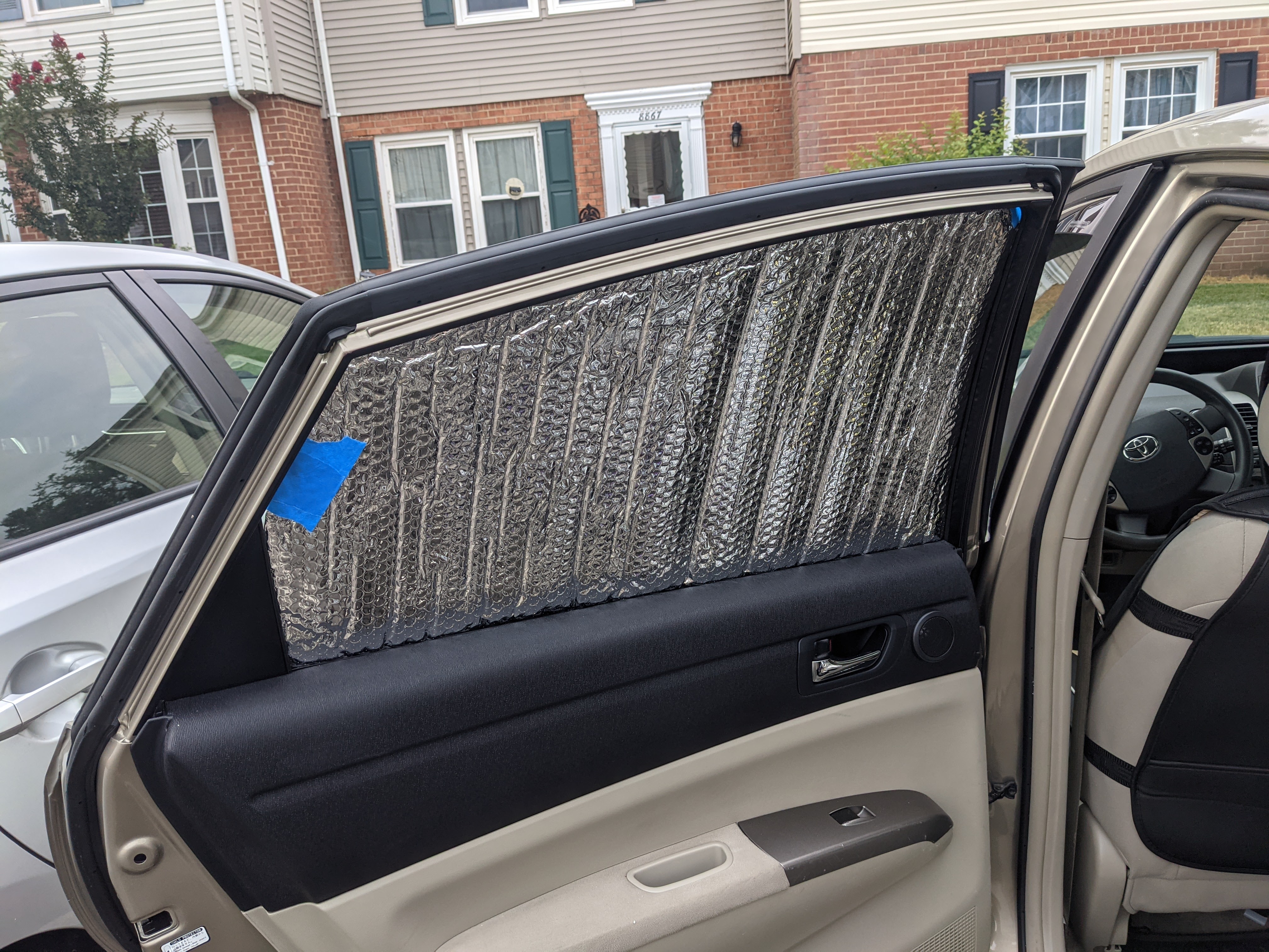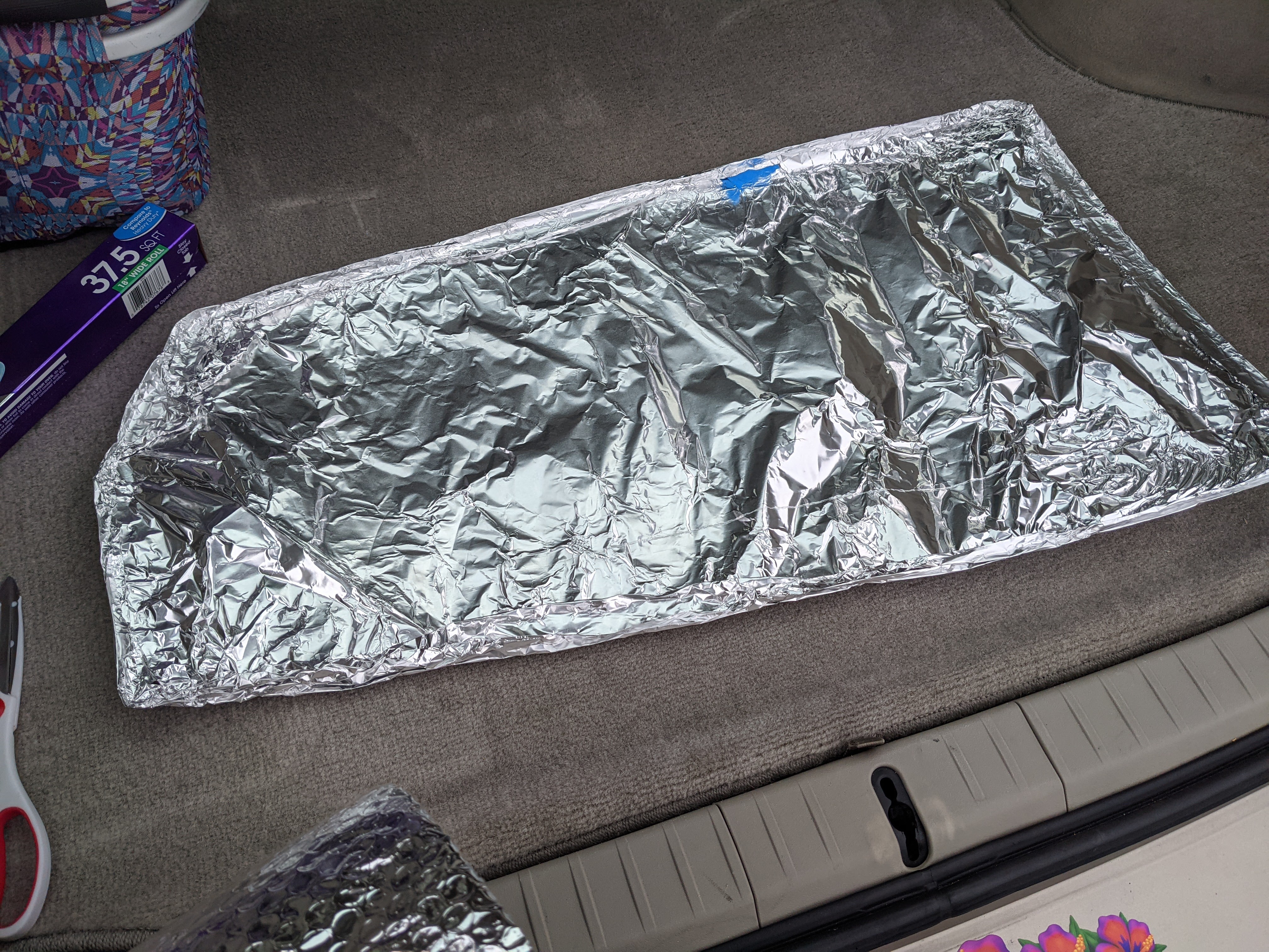 After the battle of the brushes I got started on the window coverings for the back of the Prius. I used heavy duty aluminum foil and scrunched it up on the inside of the window to make a templet.