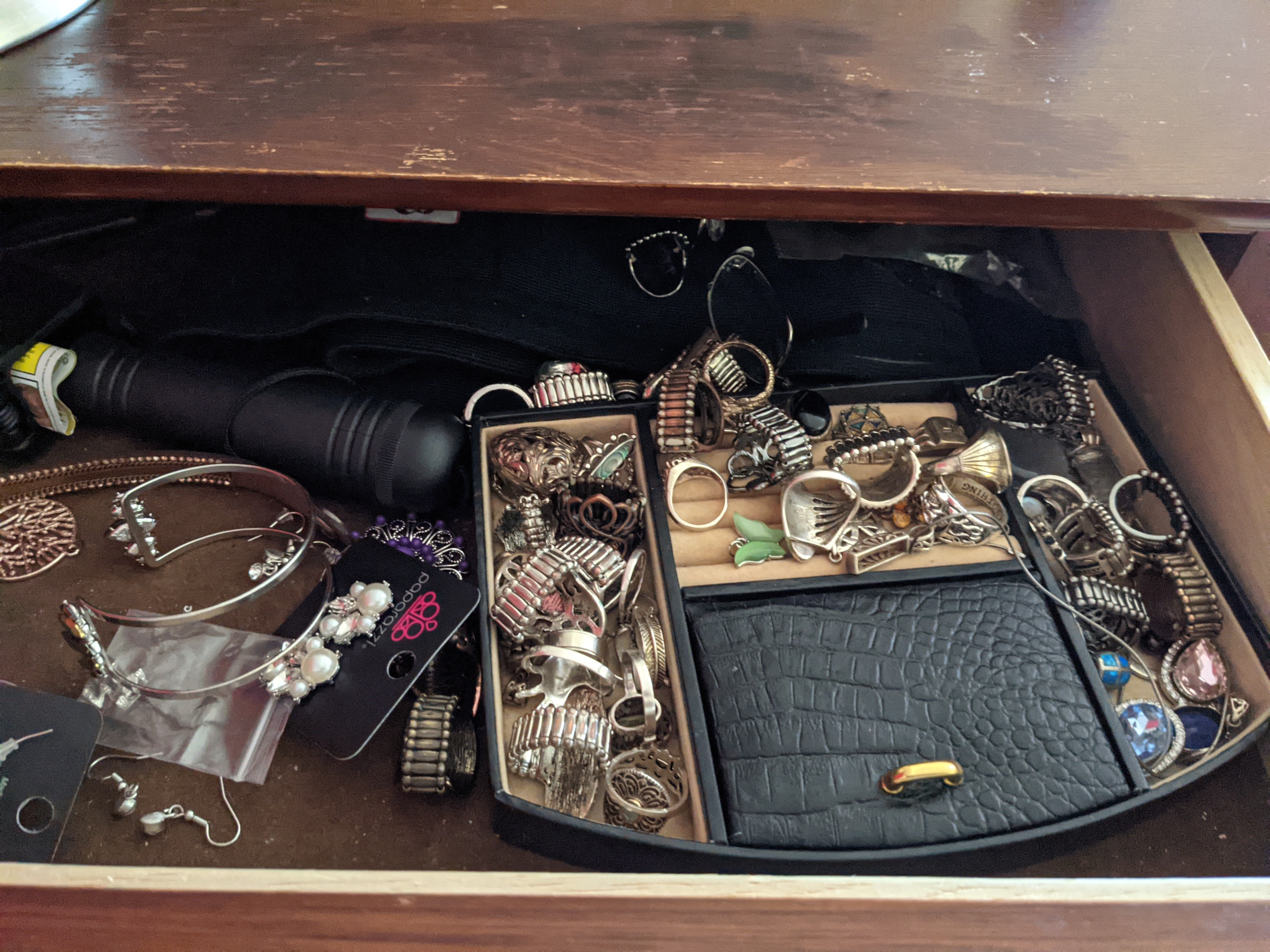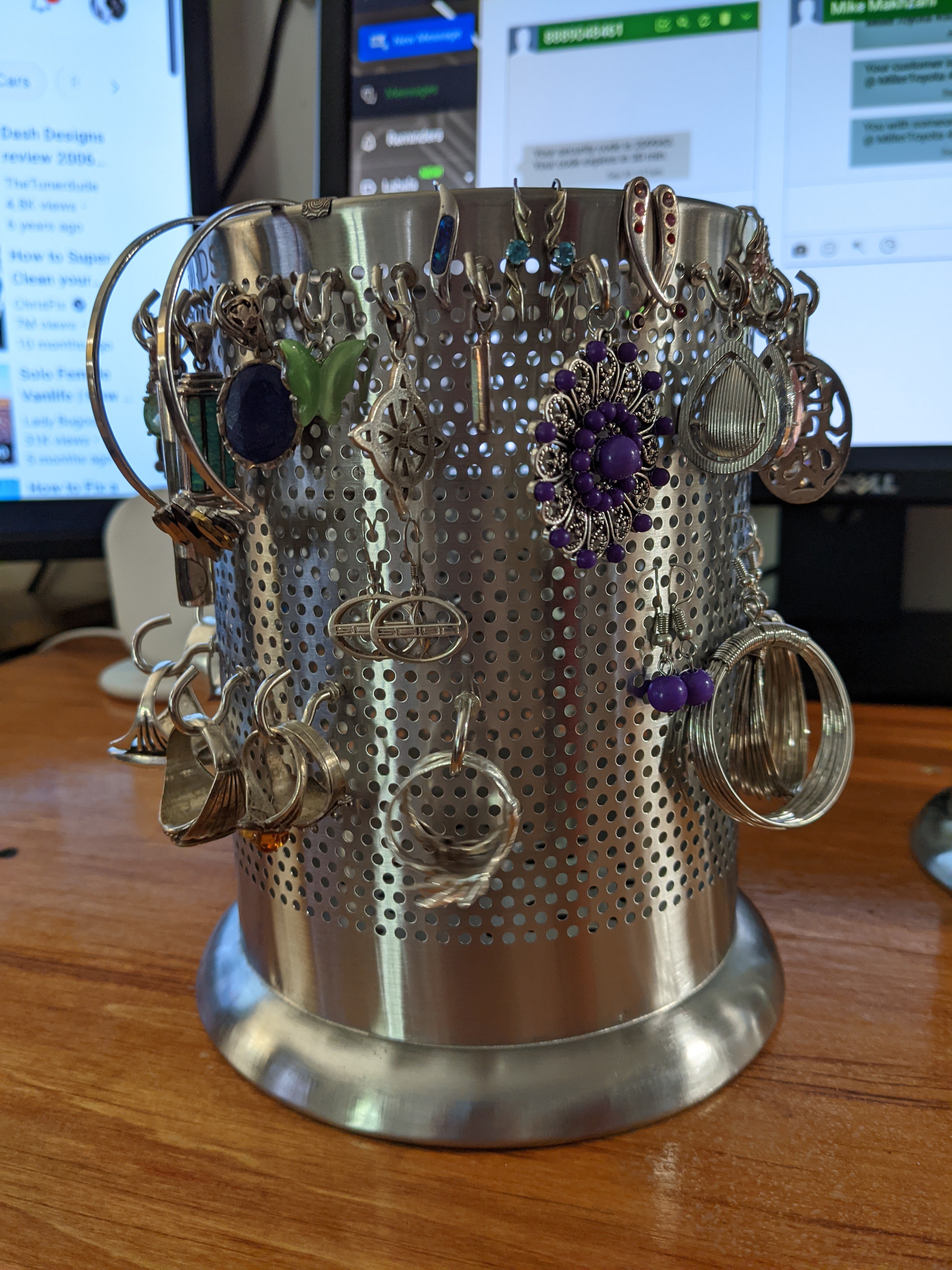 Problem solved for most of my jewelry. Actually my little sister made me think of this. She had posted about a fold-up/hanging jewelry thingy, but I don’t have the wall space for that. This is a kitchen utensil container.