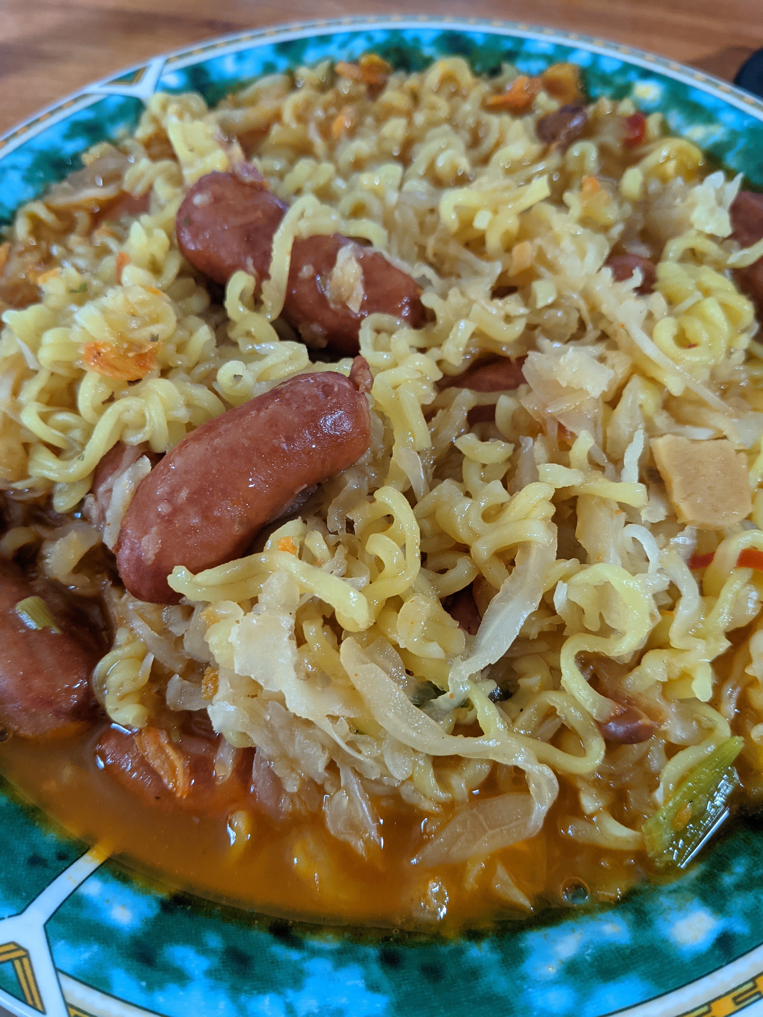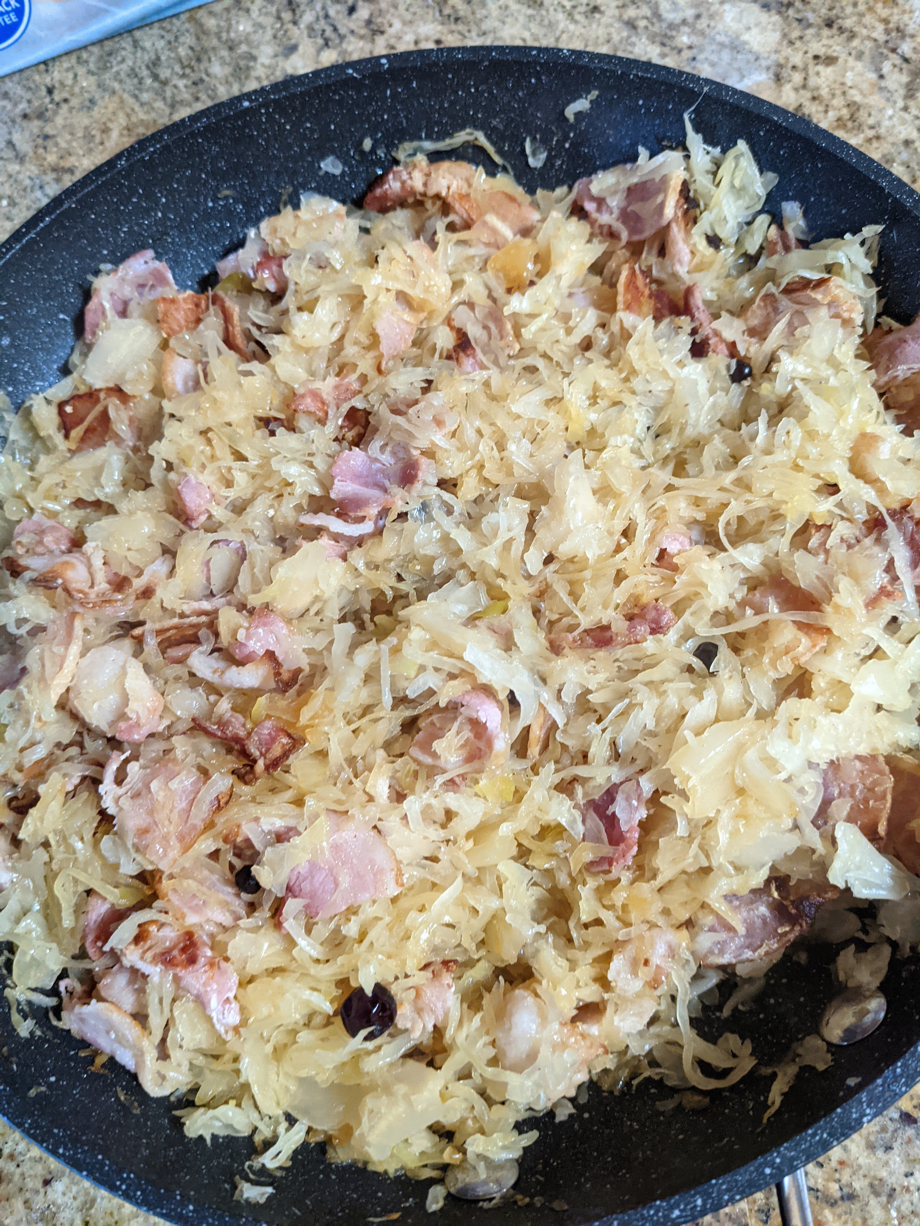 After it was cooked, I added a couple of fork fulls of sauerkraut and a hand full of cocktail wieners. it was so good.