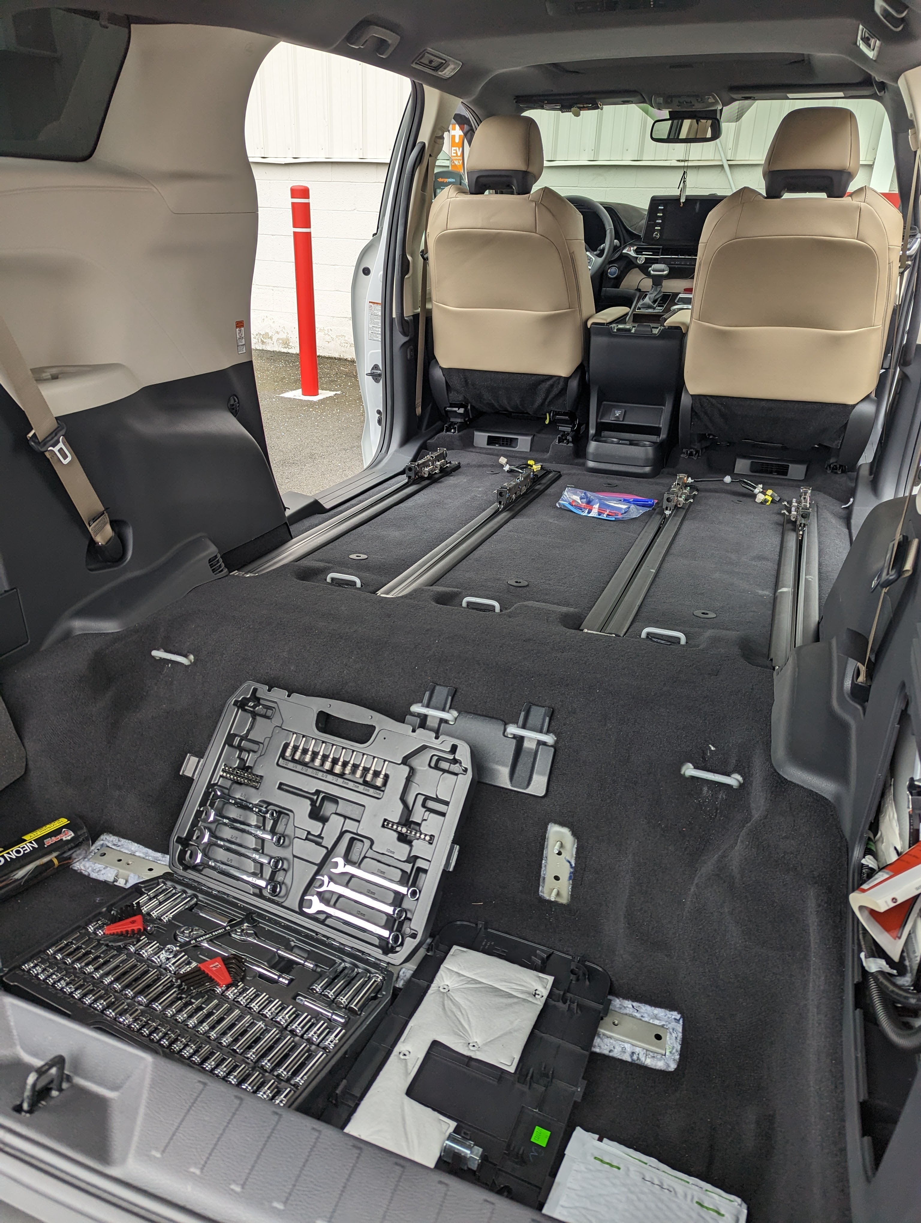 Meanwhile, the guys at work jacked up Miss Pearl yesterday to remove the seat rails. I was going to build over them, but I would lose 2 inches of headroom which I’m unwilling to give up. The two outer rails came out pretty quickly. The two center rails, not so much. After everything was disconnected, we could not remove those two rails because the airbag wires were connected to the ones under the center console.