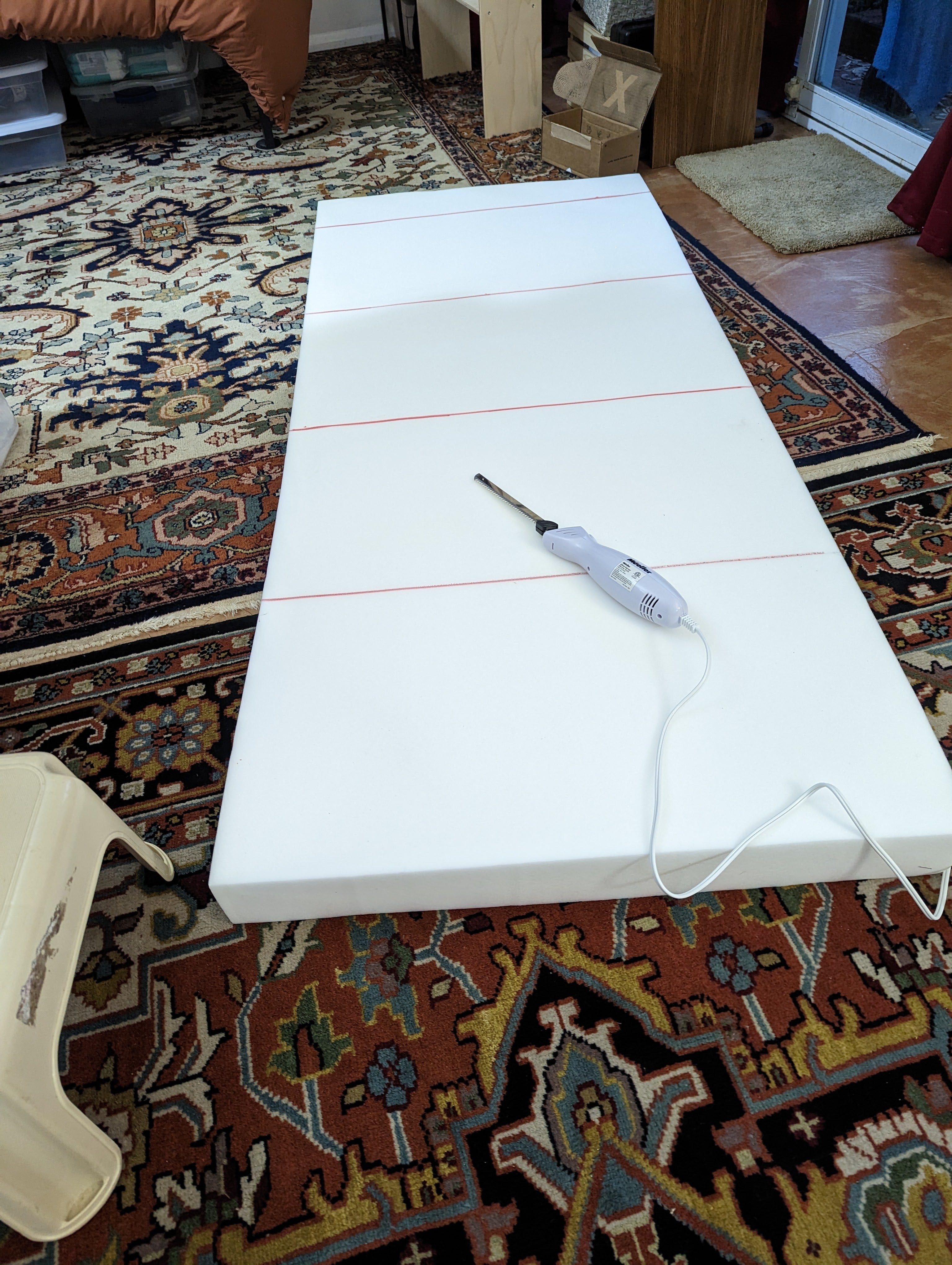 Meanwhile, this was my job this morning. Cutting up my mattress in sections with a meat cutting knife. Ha, this is probably the first and last time I will use that knife. It cut the mattress like butter.