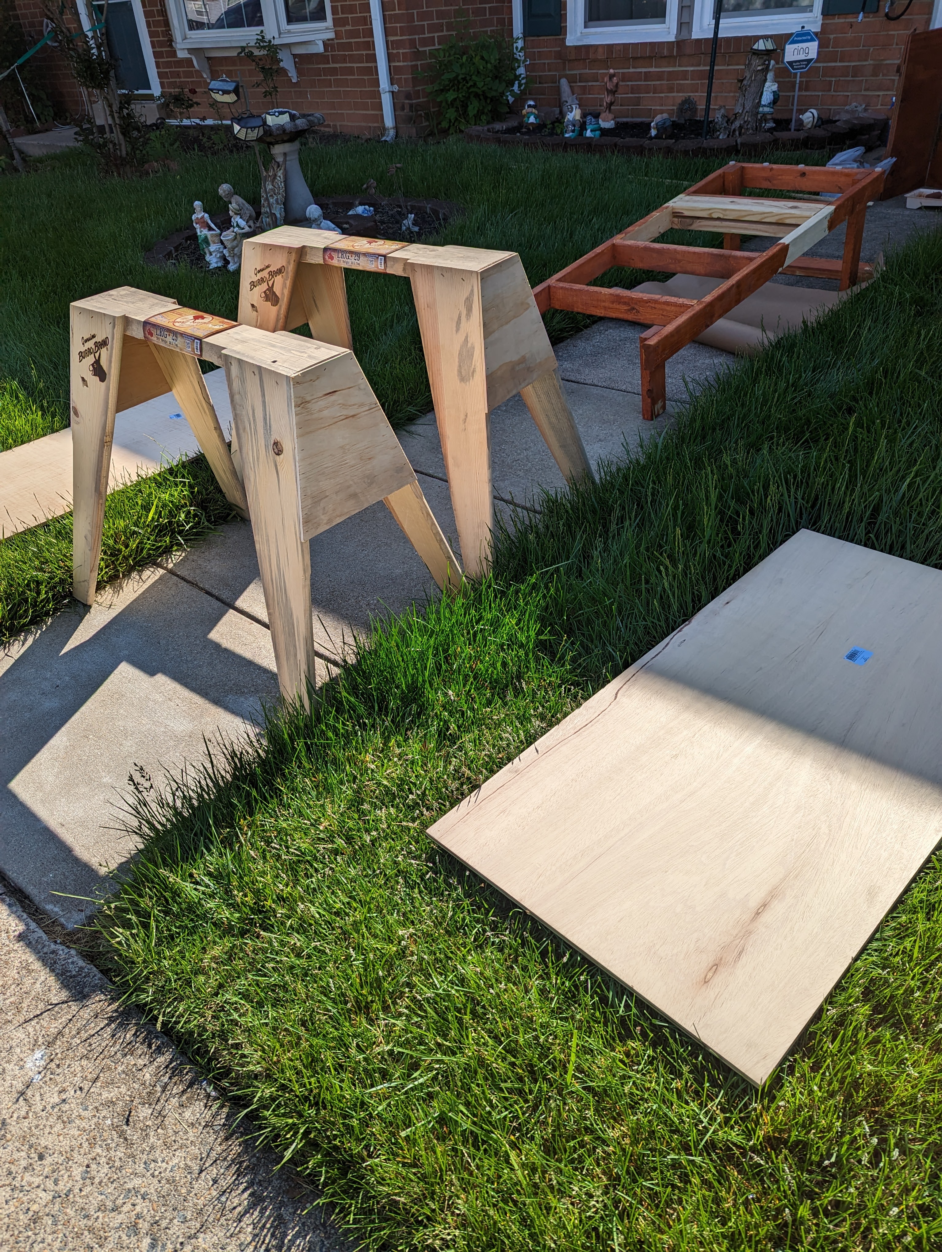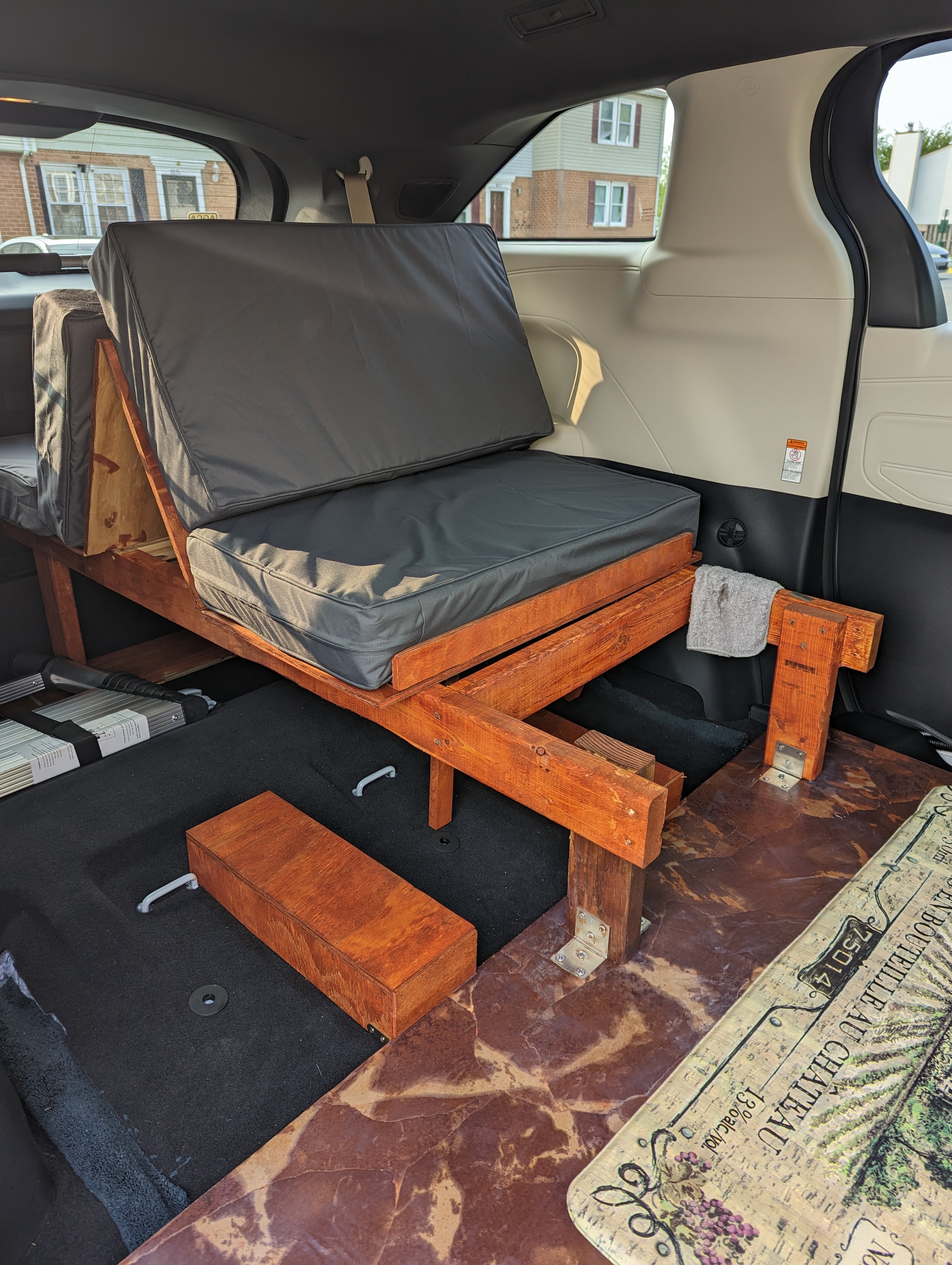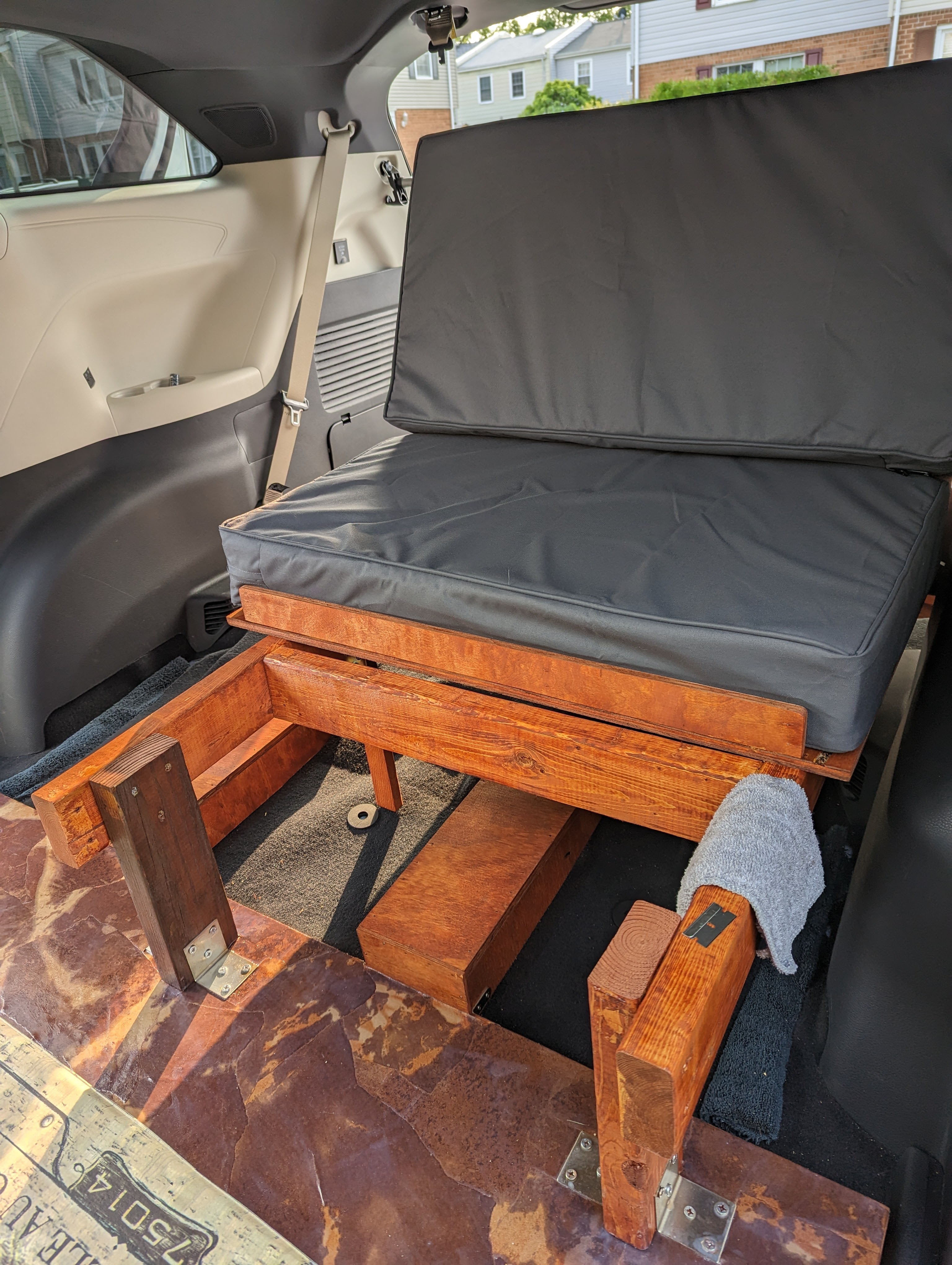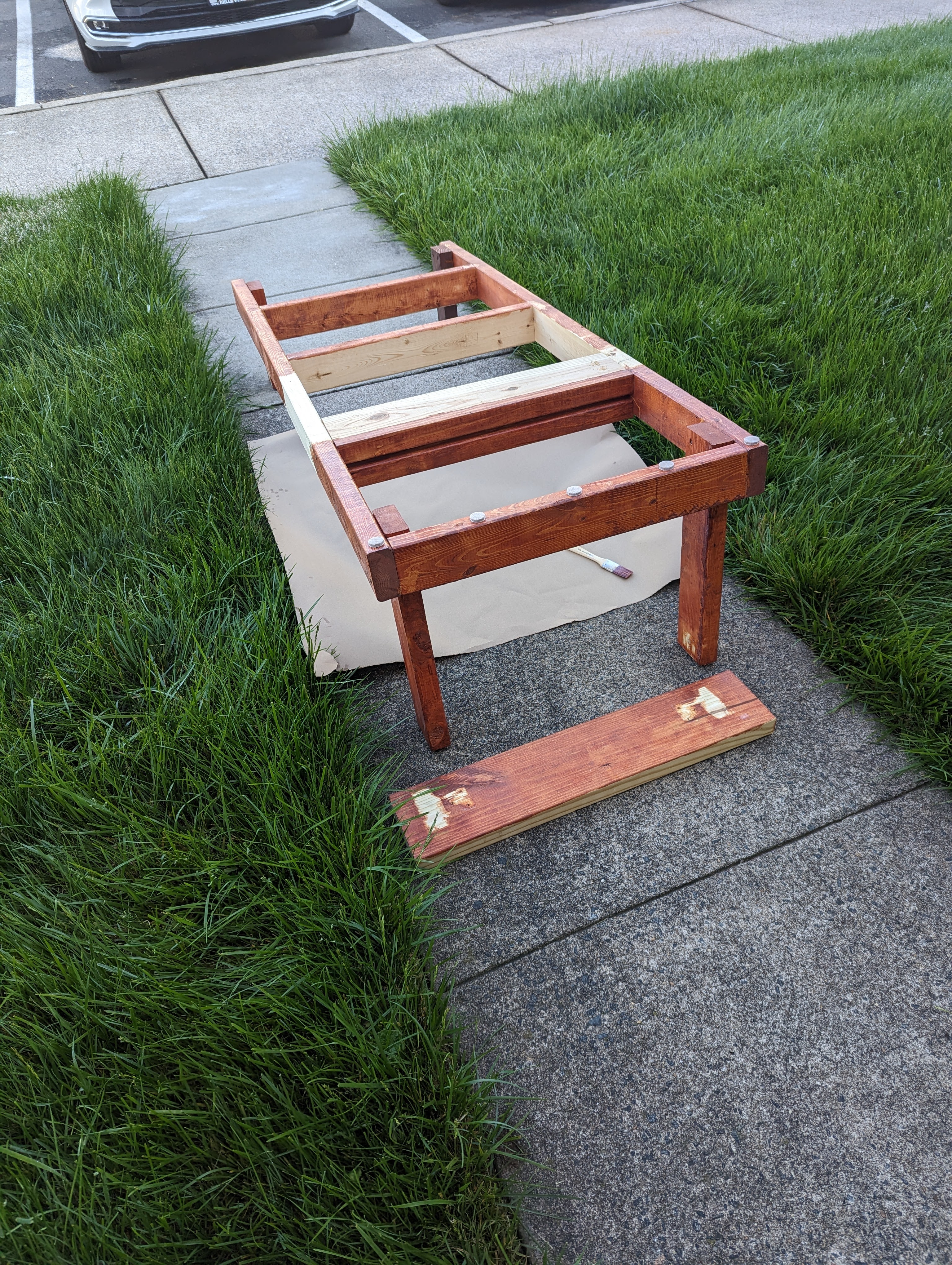 I pulled the bed/couch out last Sunday so that I could cut the legs a couple of inches and finish staining the parts I couldn’t get to while it was installed.