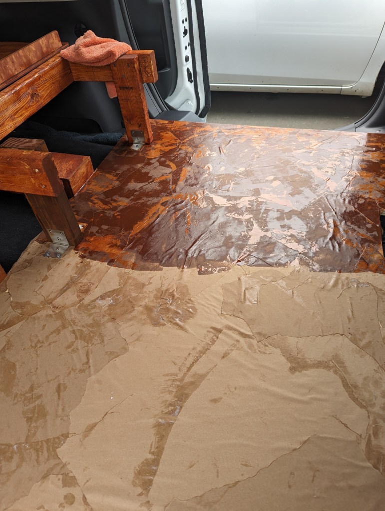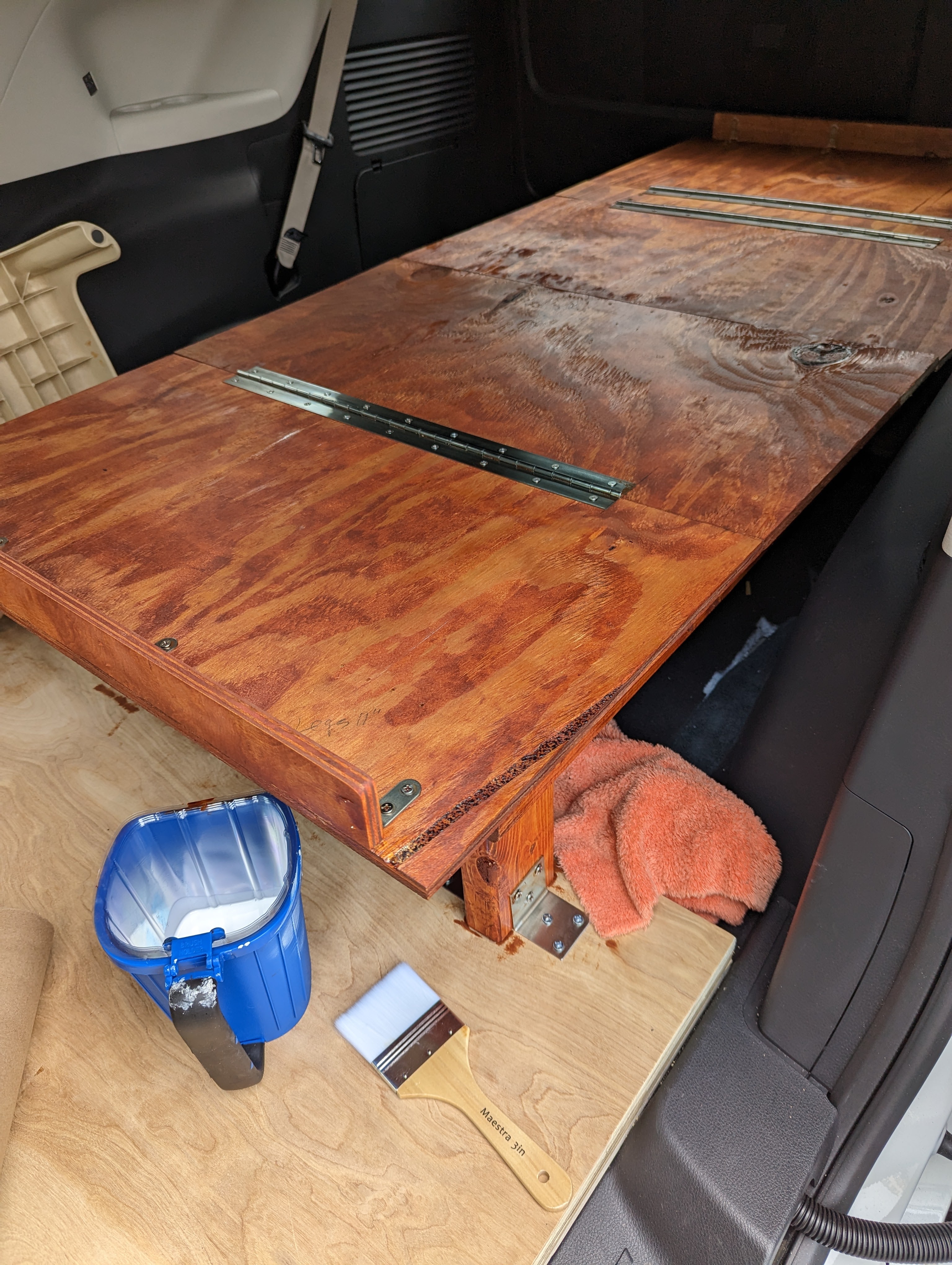 Yesterday morning I stained the wood in the van. I’m super glad I took some Aleve before bed last night. I would have been sore as all get up this morning.