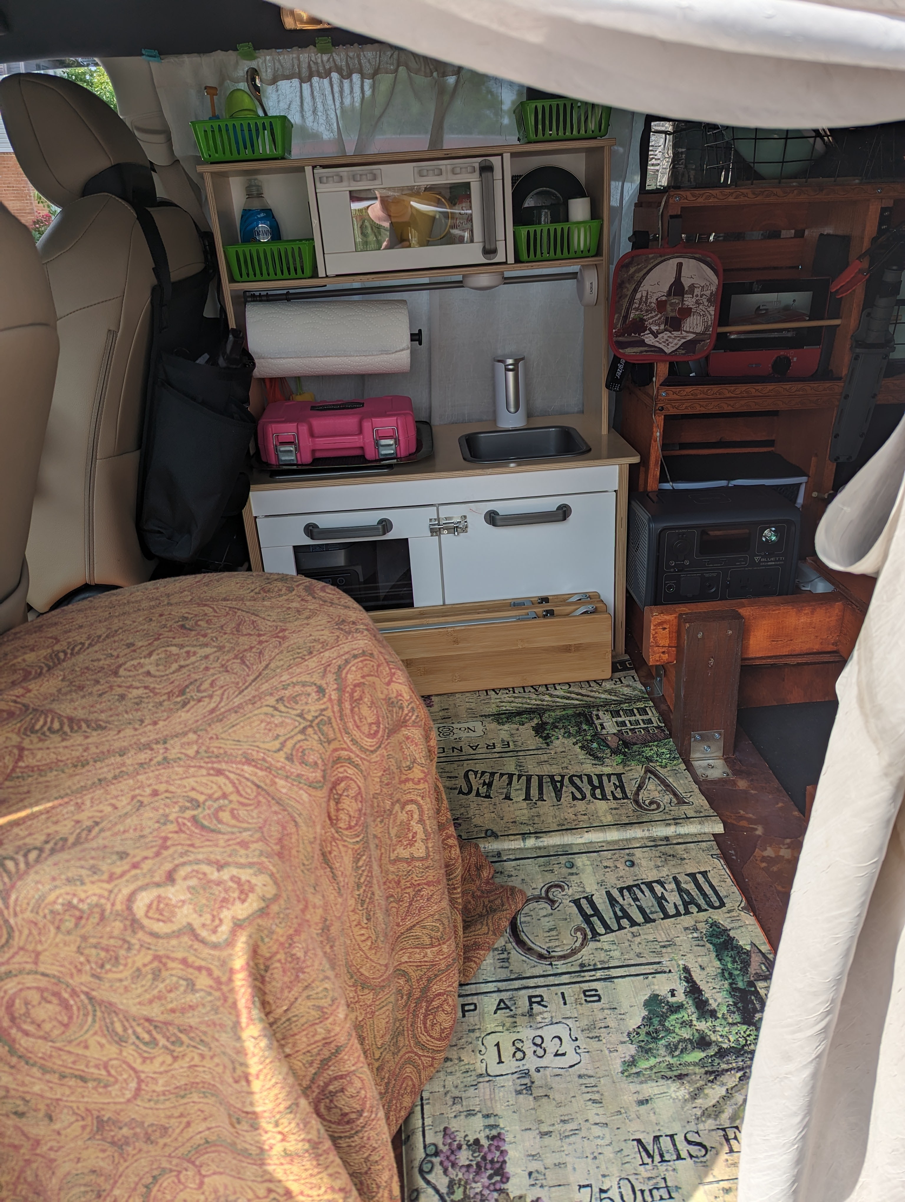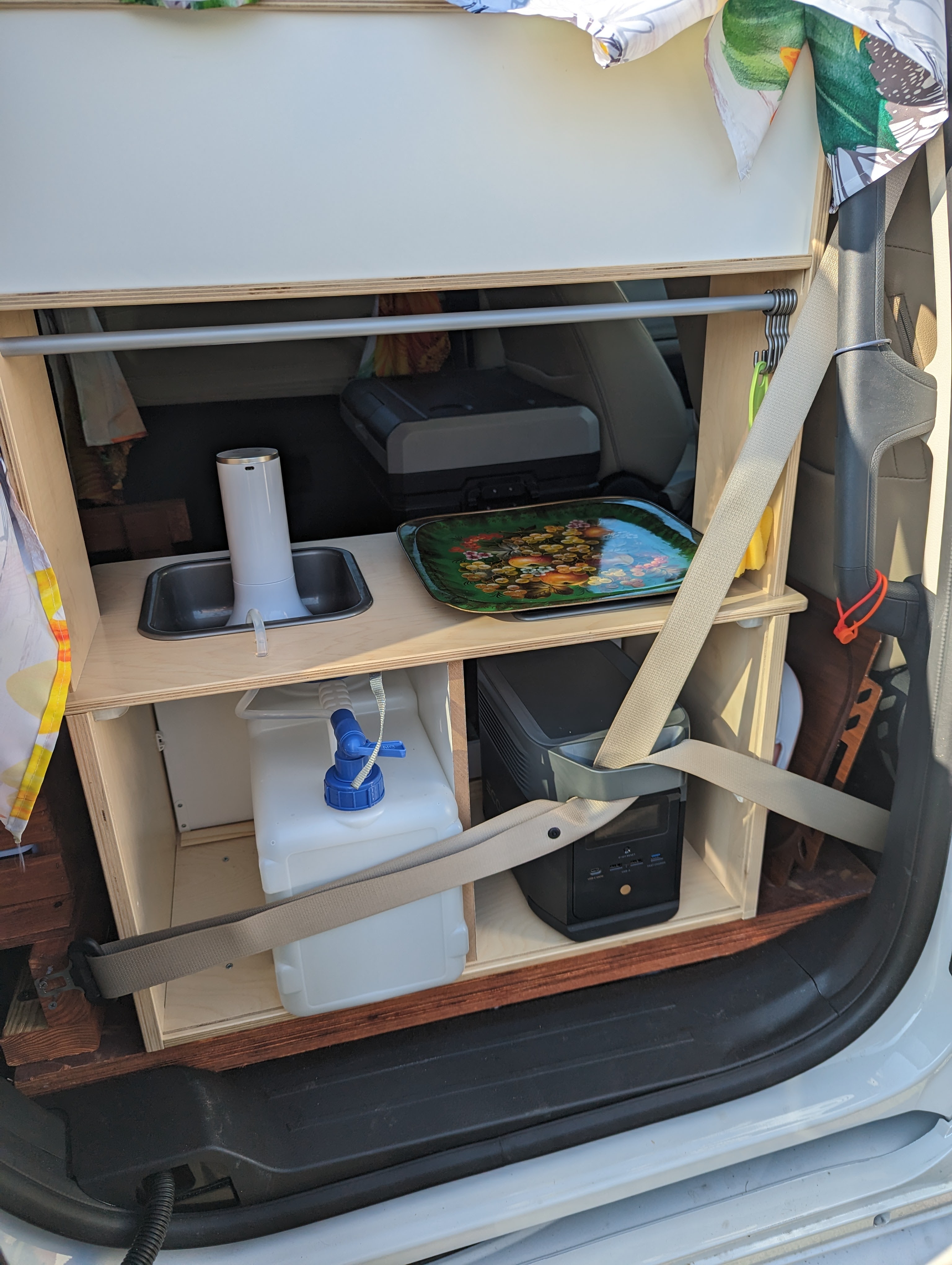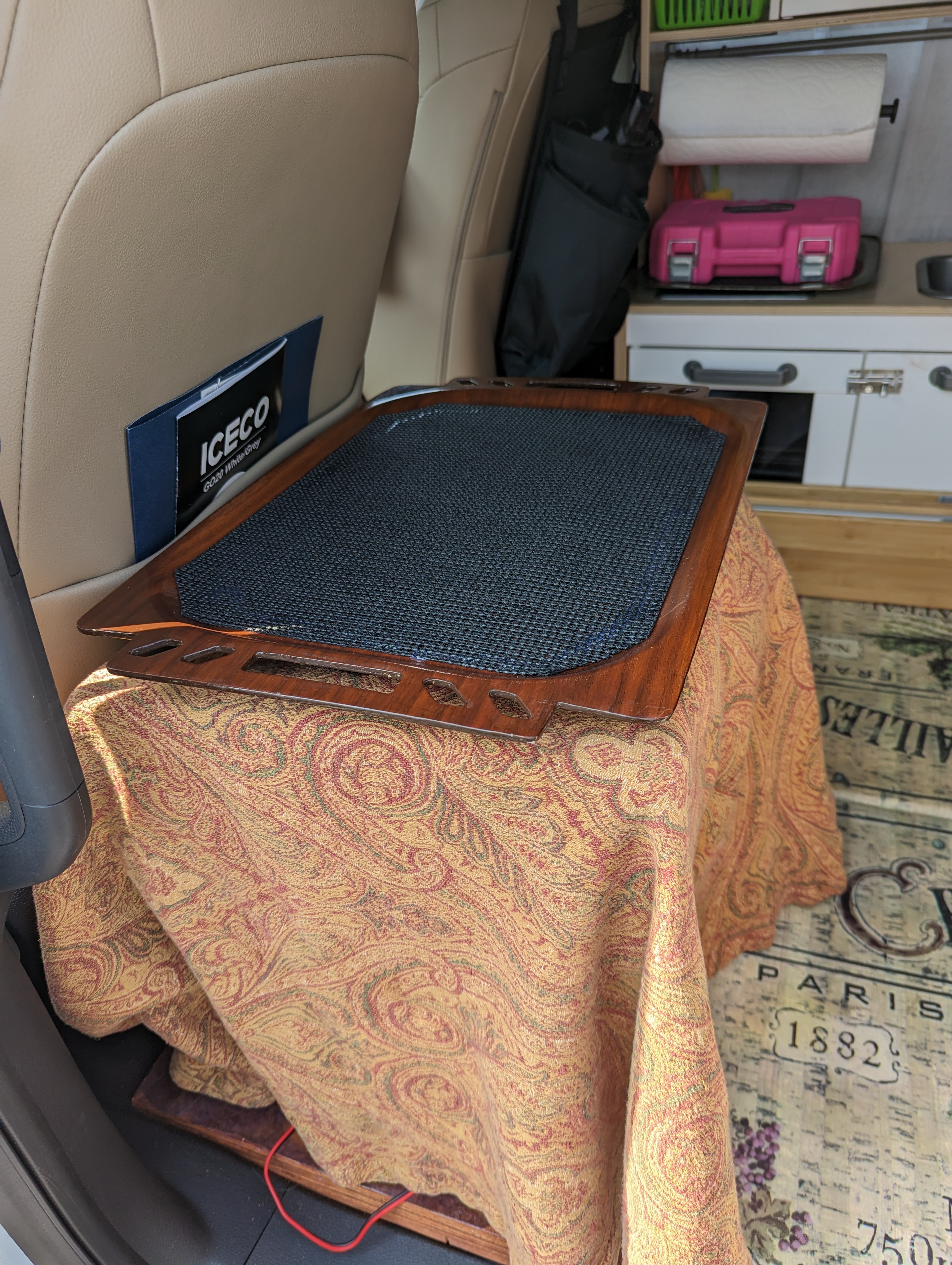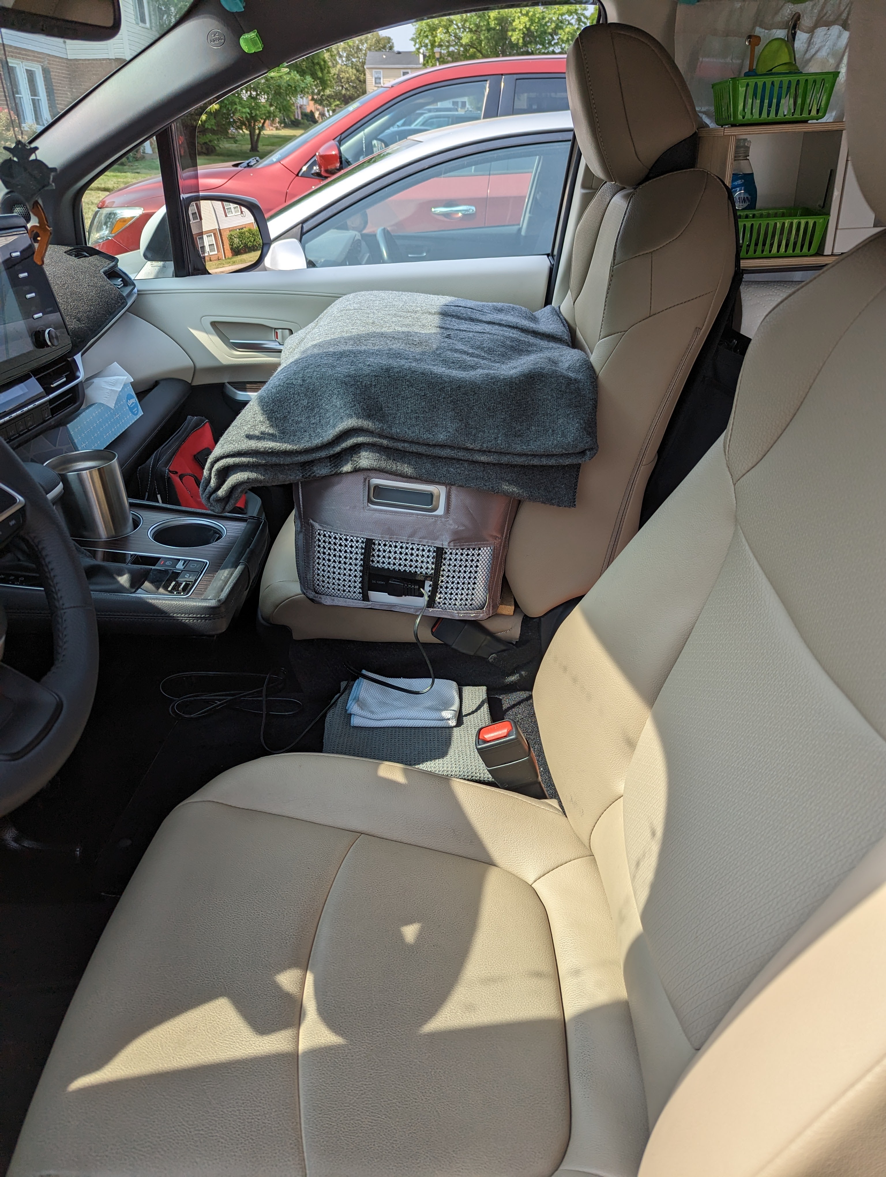 On the left is my toilet. First, it was the home for the fridge/freezer, but that thing took up too much room. I sold it and bought a much smaller one that sits on the passenger seat.