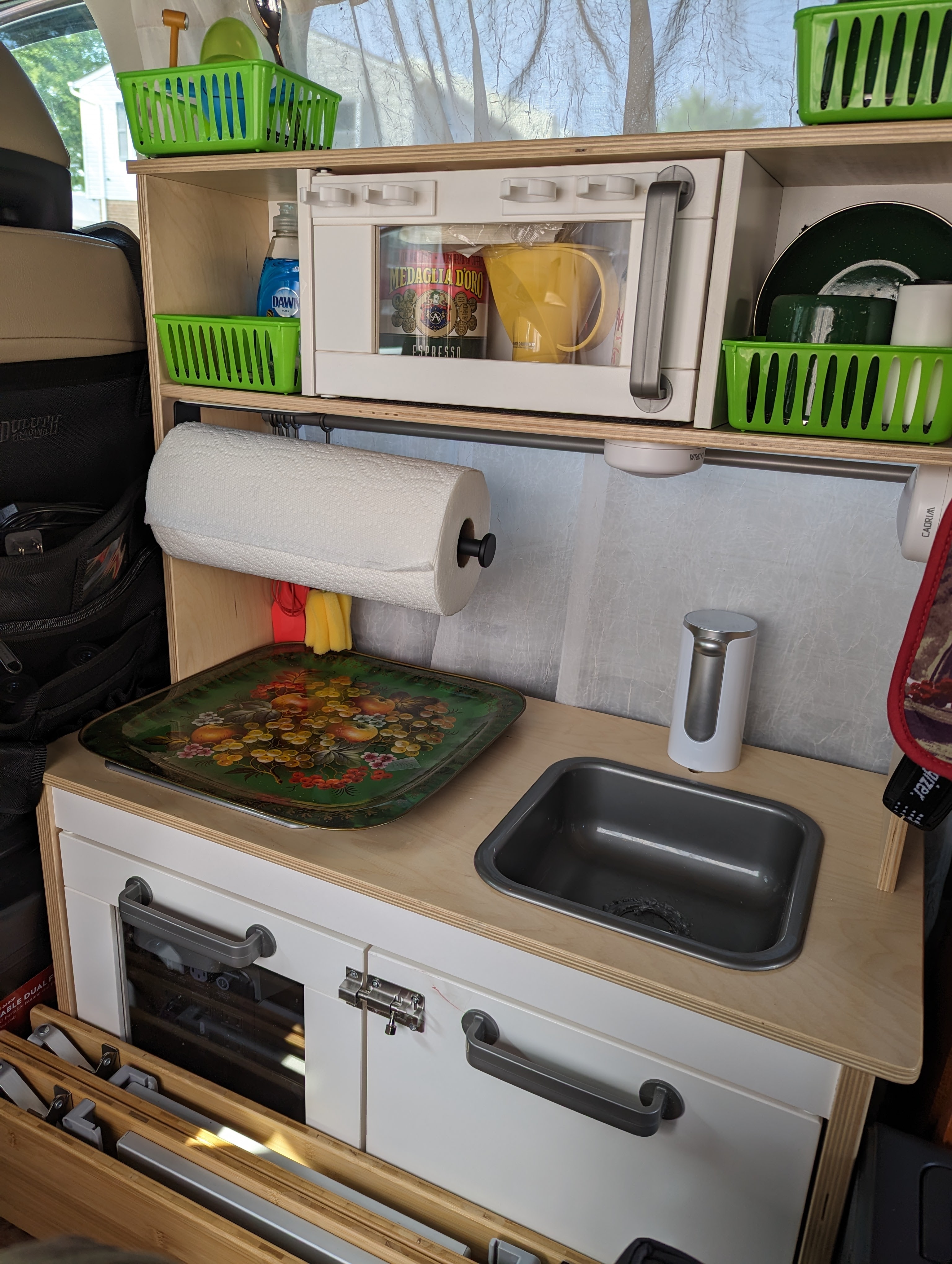 This is the kitchen stocked up. I put a lock on the bottom cabinet in case things want to fly out when I go around a corner too tight. I have changed the curtains with white ones I stole from my townhouse.