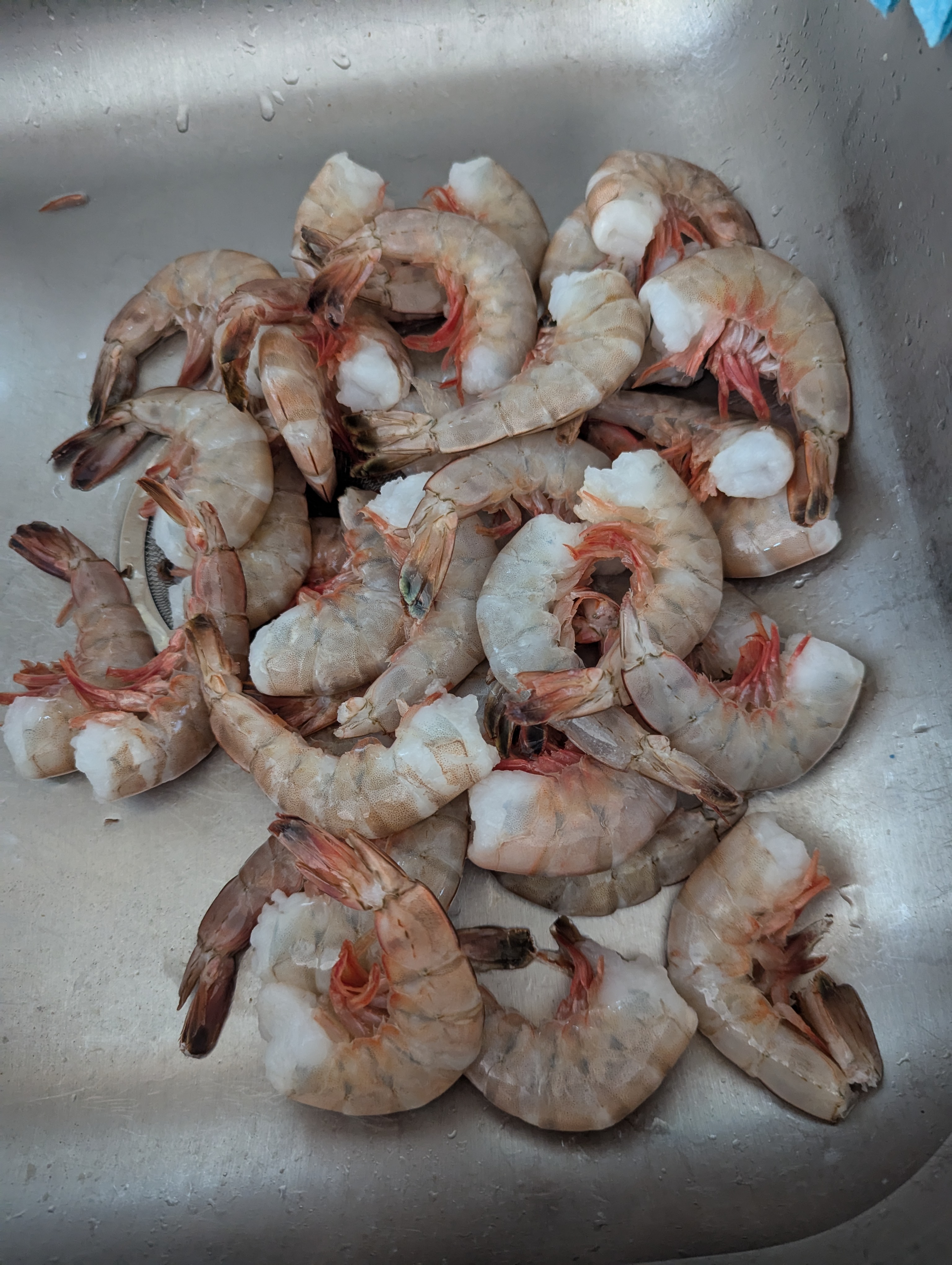 I’m getting ready peel these monster shrimps. I’ll have them cooked tomorrow in butter with eggs.