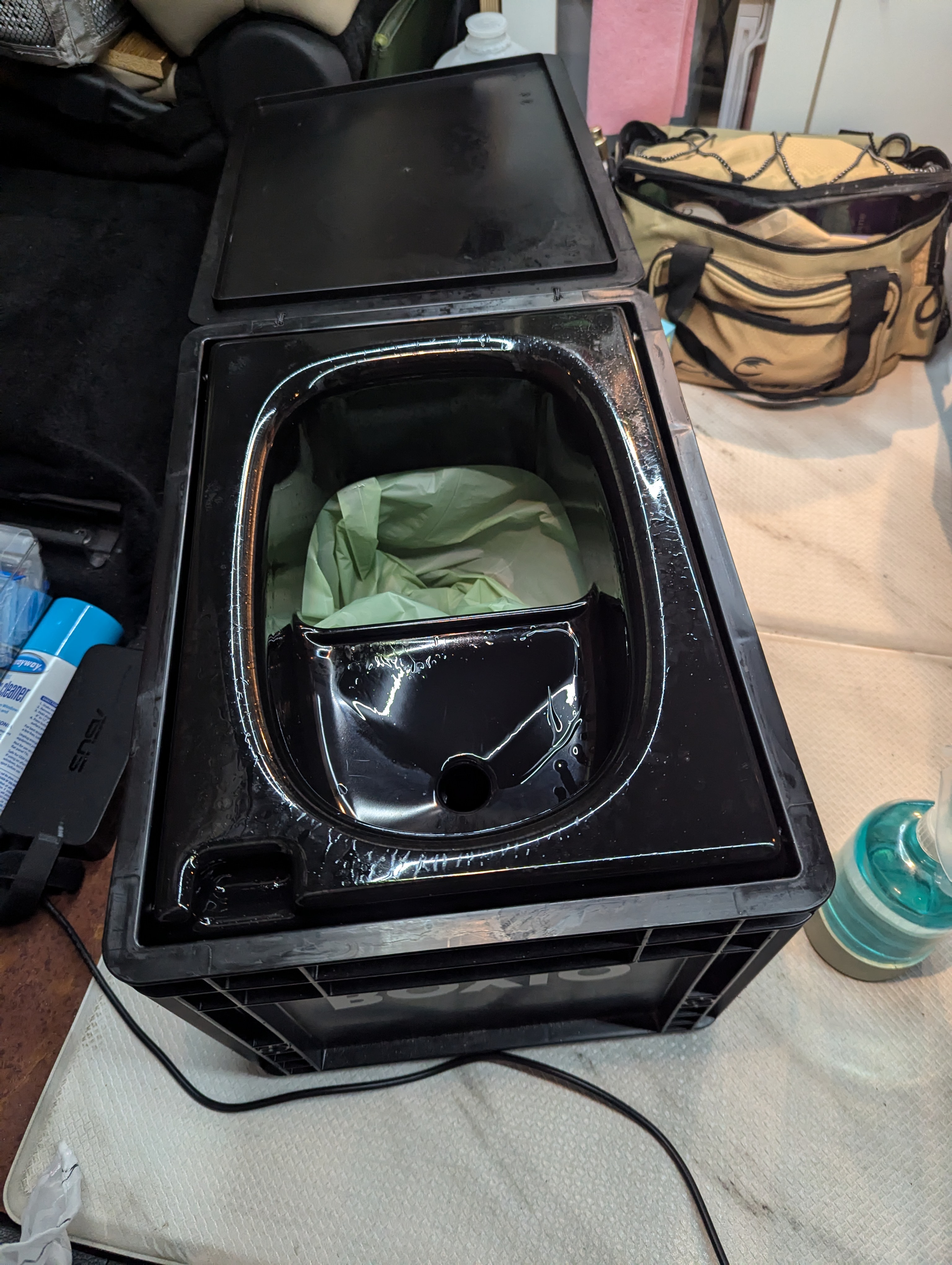First I dump the pee container, sanitize everything and put in a new paper bag.
