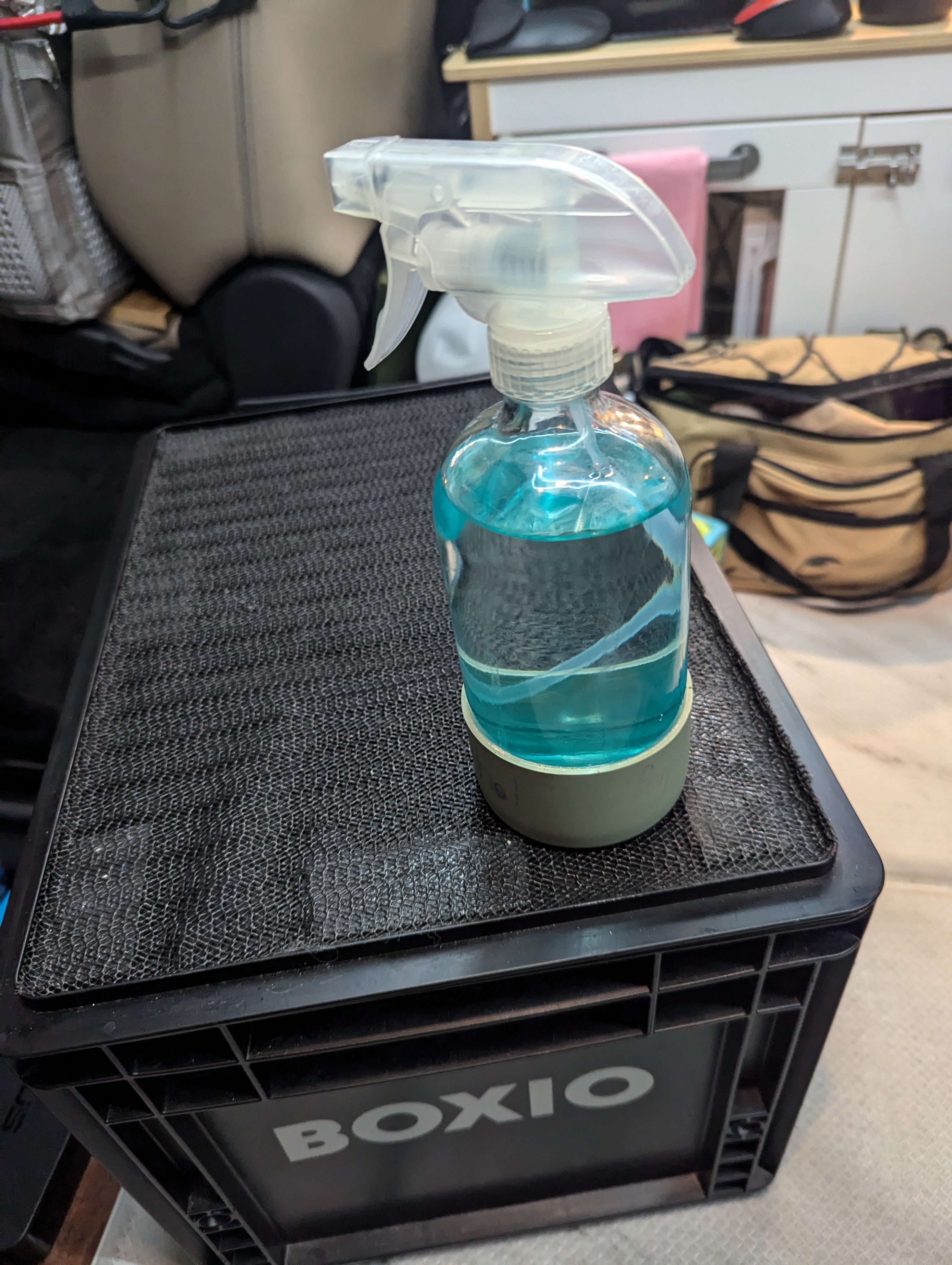 I have three bottles of cleaning items. The first on the left is just plain water. The second one contains a mixture of 70% alcohol with a few squirts of Dawn dish liquid. The third one is water and vinegar.