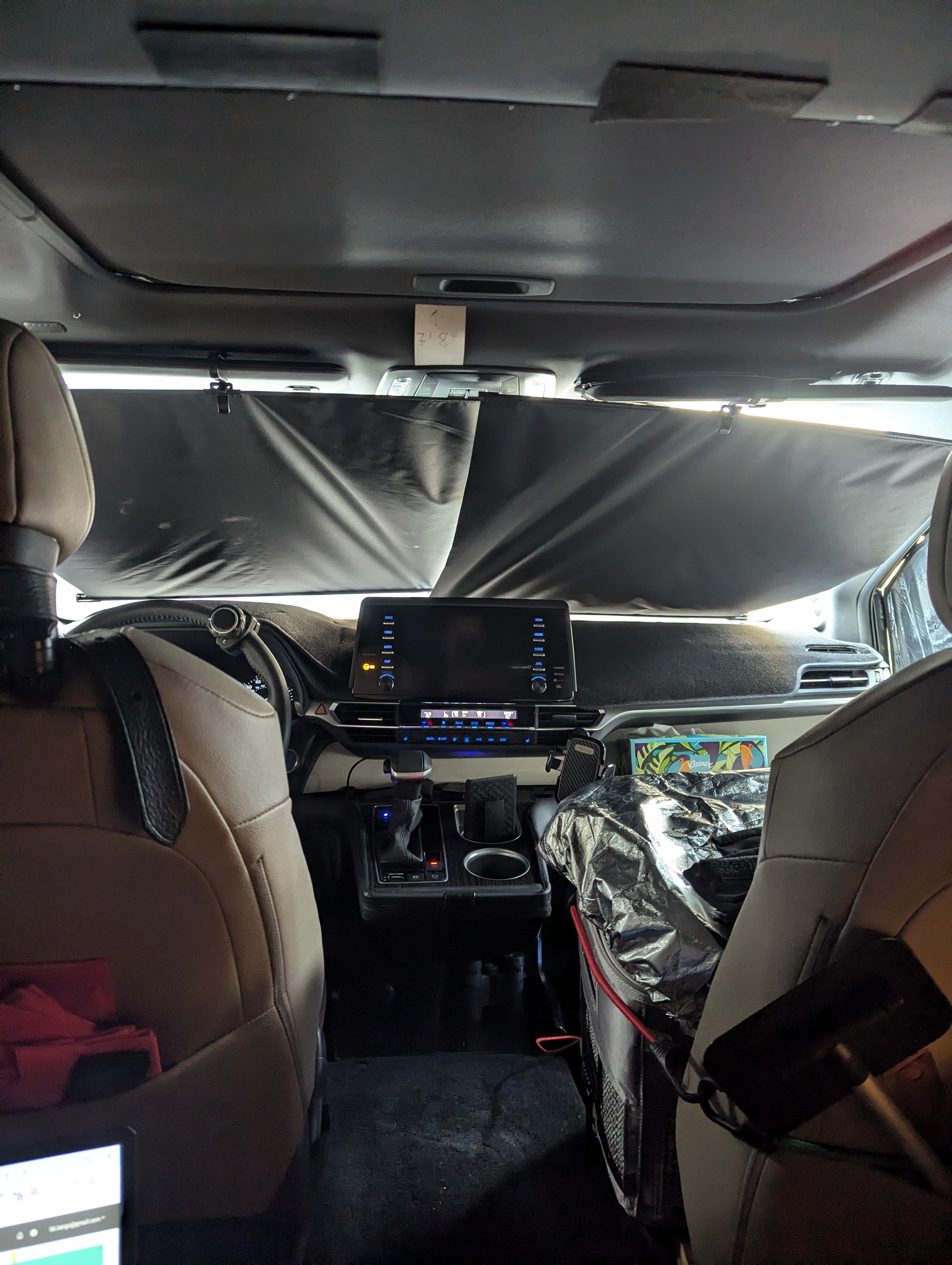These window covers are good for where I’m parked at. I don’t have any people walking by that might get nosey. When I am near the public I always attach the curtain behind the front seats. It’s too bad that I can’t turn off the dash lights. We used to be able to do that. Now I can only dim them, which totally sucks. I’m still thinking about attaching a curtain right over the windshield that will block out everything. Maybe I’ll work on that tonight. When you start to modify a vehicle, you are never ever done. There are always little tweaks to try to make things better.