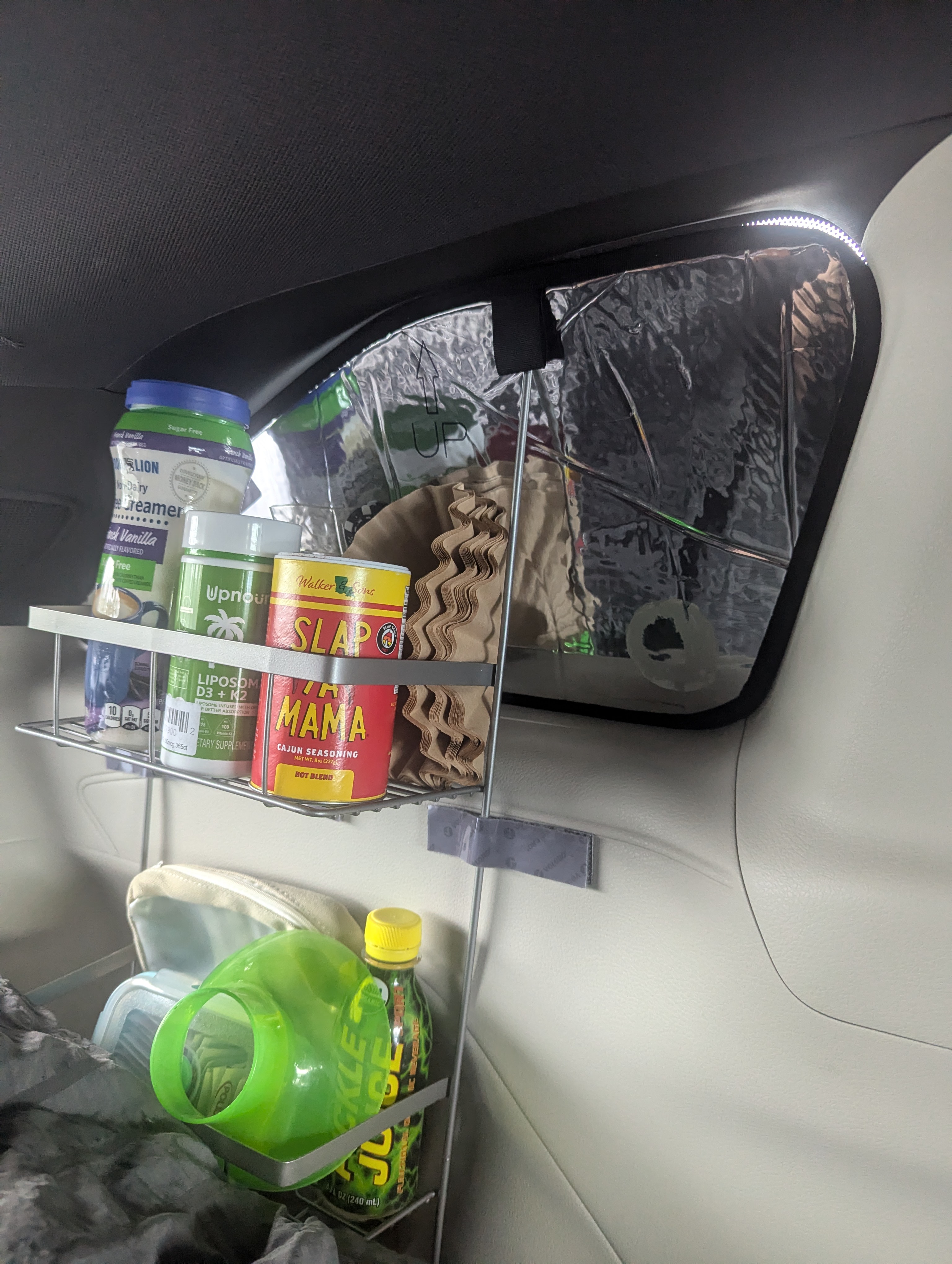 I modified this bathroom shelf unit to fit over the cup holder in the rear of the van. It helps to keep things handy. I hate to have to dig for things that I need.