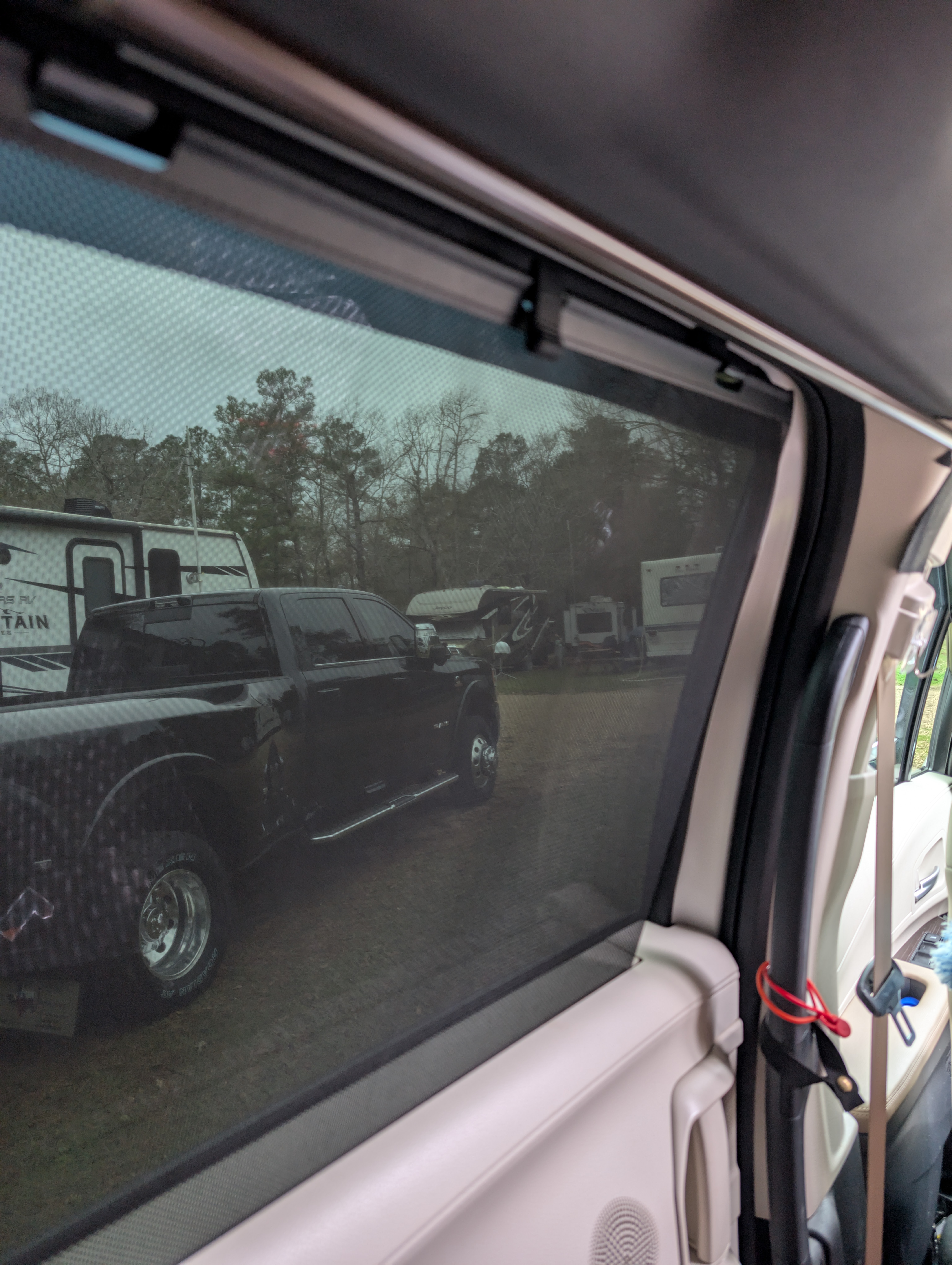 This morning, after finishing my grueling housework, vacuuming, mopping, dusting, etc., I decided to remove the curtains in front of the door. I bought them to close in front of the door while it’s open. I’ll never use or close them because keeping the side door open while the van is not running will run down my house battery. I will keep the rod up to dry my bath towels or find some other use for it.