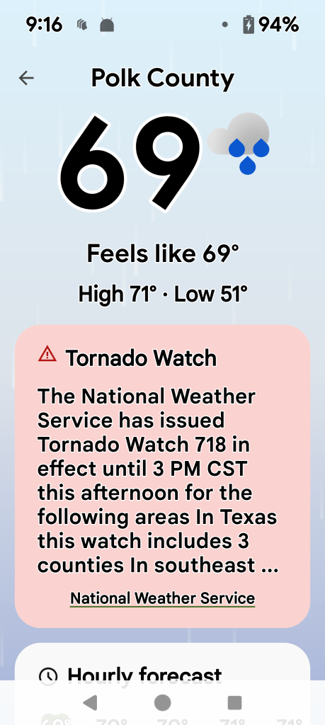 We started with another Tornado Watch yesterday morning. It looks like the Houston area was hit, but not near me. We did get a ton of rain, but not much wind. By 1:30 in the afternoon, it was over, but for more rain.