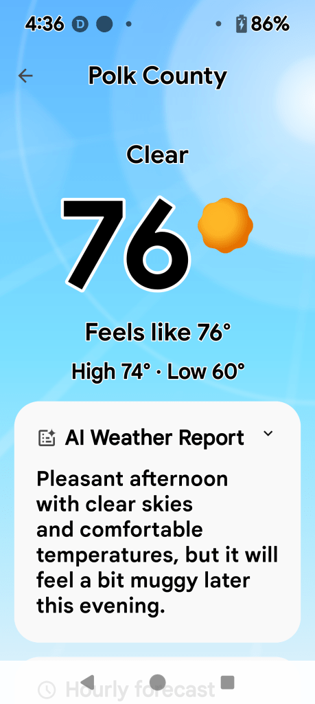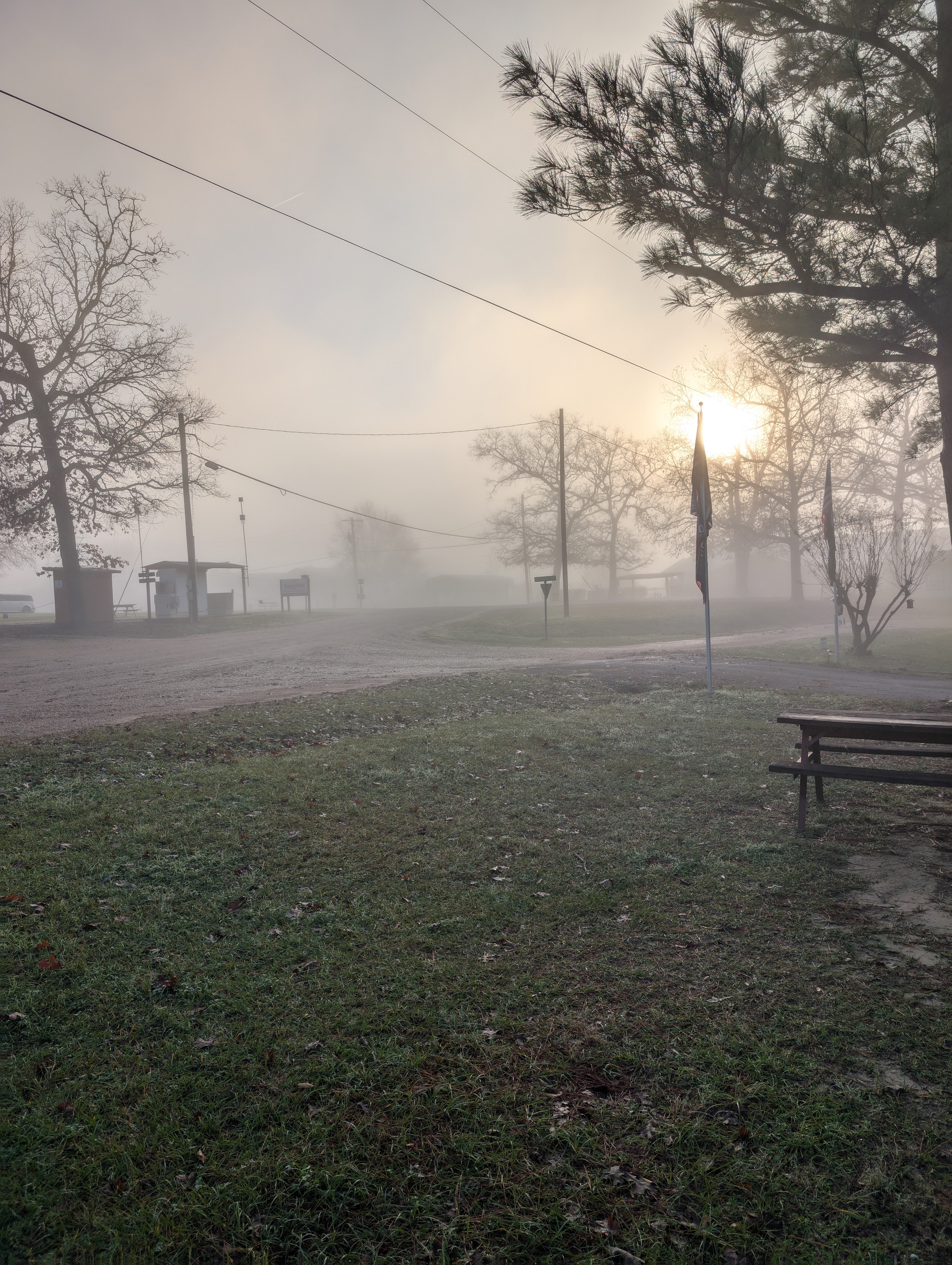 This was this morning. It was beautiful but foggy. After the fog died off, I headed to Walmart, about six miles from here. I needed to pick up a couple of gallons of water and some meat. We had a “boil the water before you use it” situation here from a broken water pipe yesterday. No big deal. Shit happens!