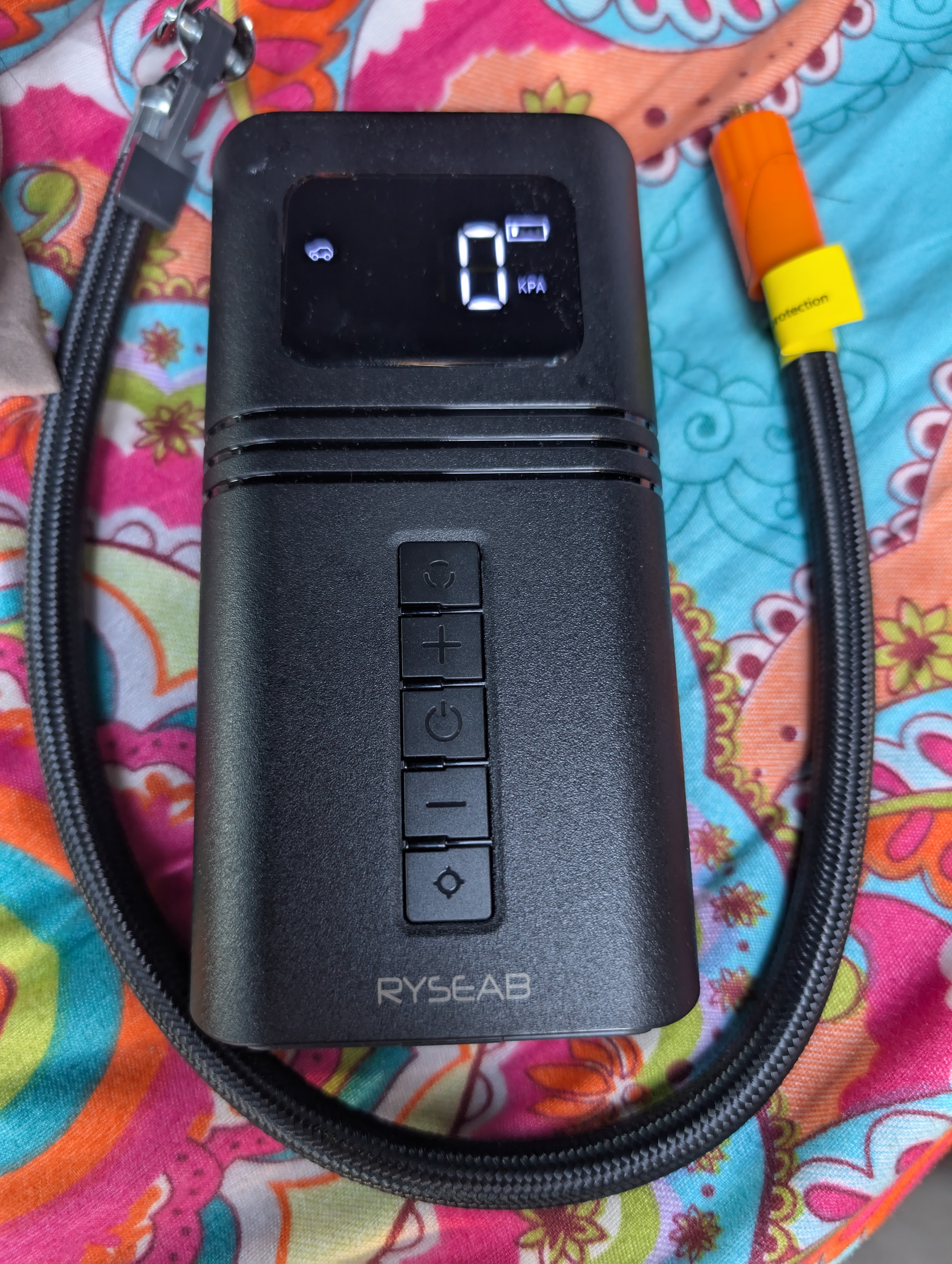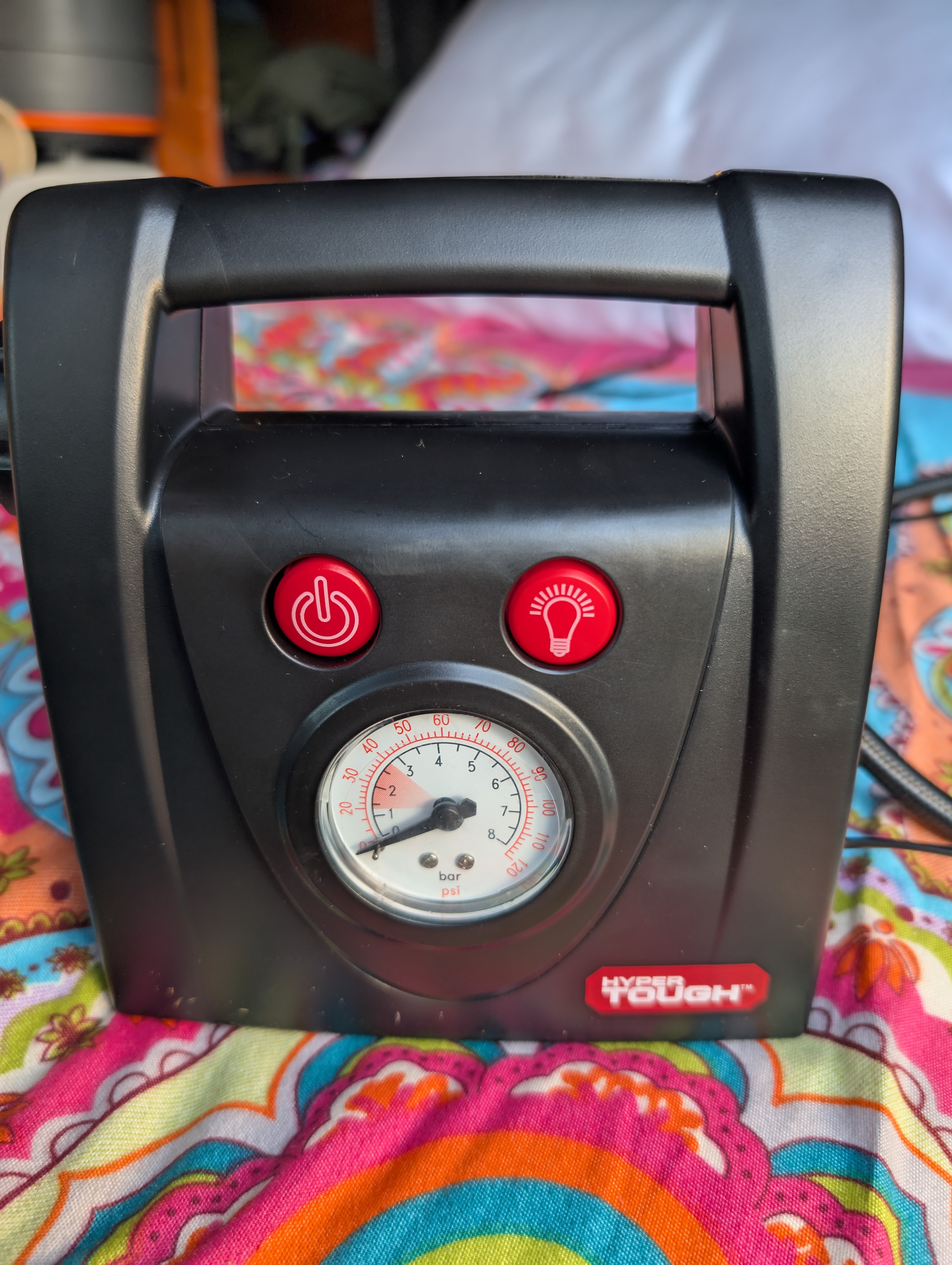 I have one of these cordless air compressors, which I couldn’t get to work. Finally, after fully charging it, I got it to turn on. While I was trying to get that damn thing to work, I talked to T-Jay, and he recommended the plug-in kind below. Meanwhile, Dan, from down the street, helped me out with his air compressor. It was good for a few days, but then it slowly started losing air again.