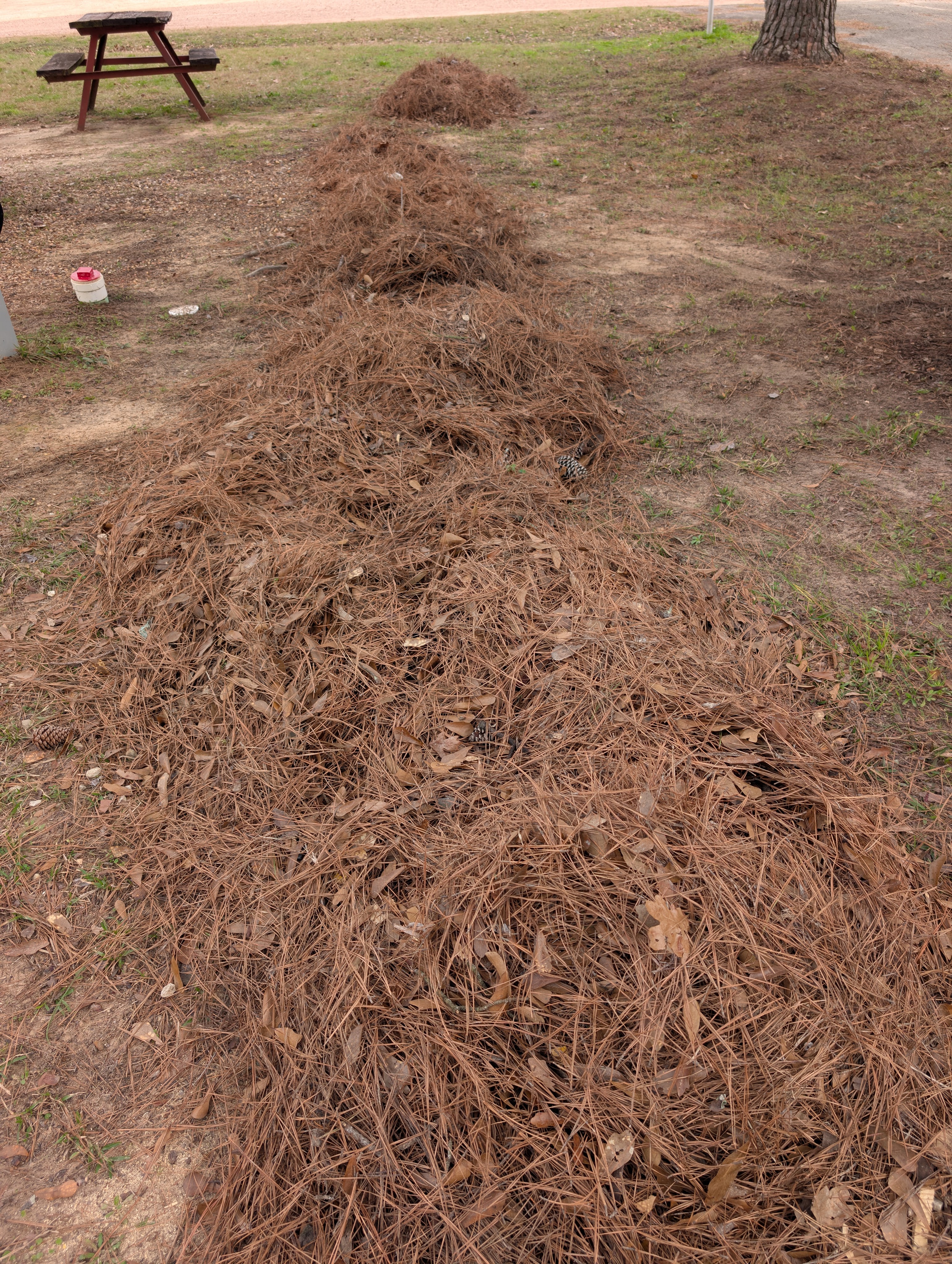 … I kept on tracking these huge pine needles into my house. You know me: once something gets on my last nerve, it has to go. Thanks to a neighbor who let me borrow his rake, I now have a clean and tidy campsite.