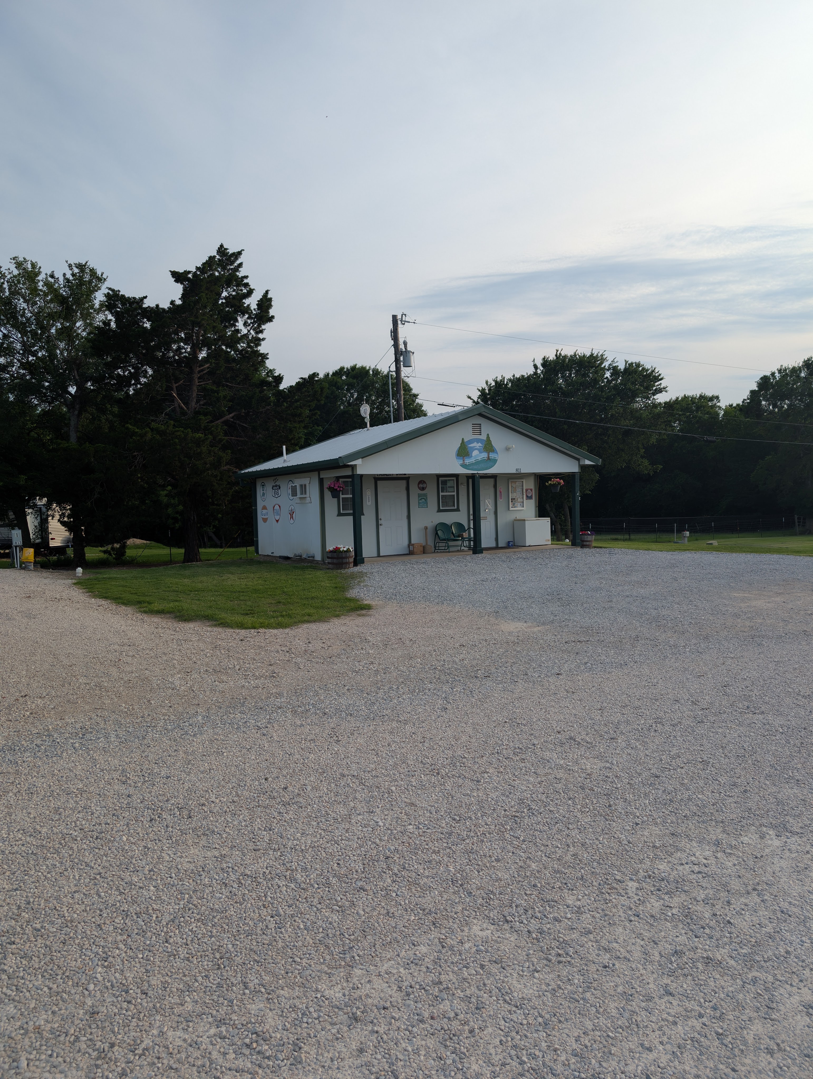 This is their office. The manager, Cheryl, lives next door, and the owners, Terry and Coe, live in a house by the pond. They are nice, friendly people. The park is clean and well-kept!!
